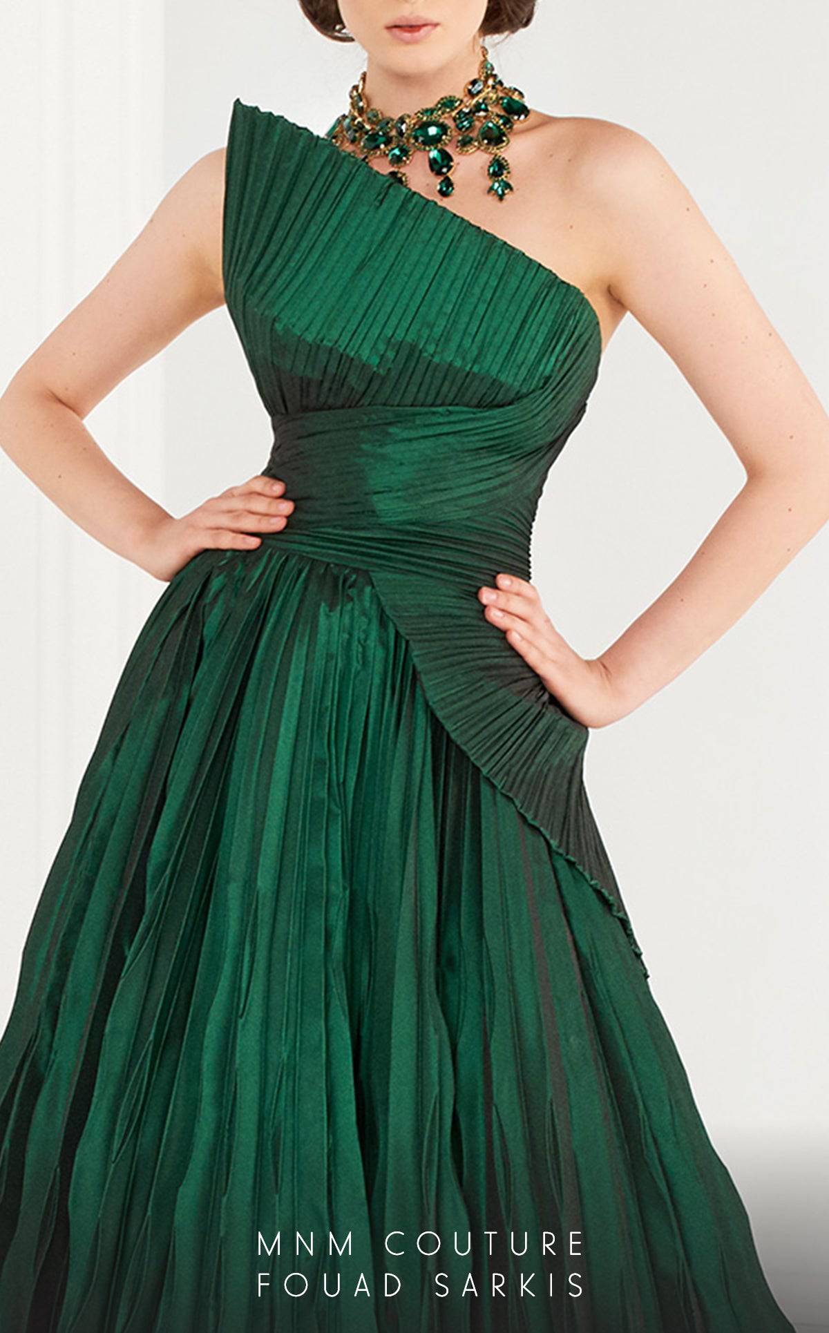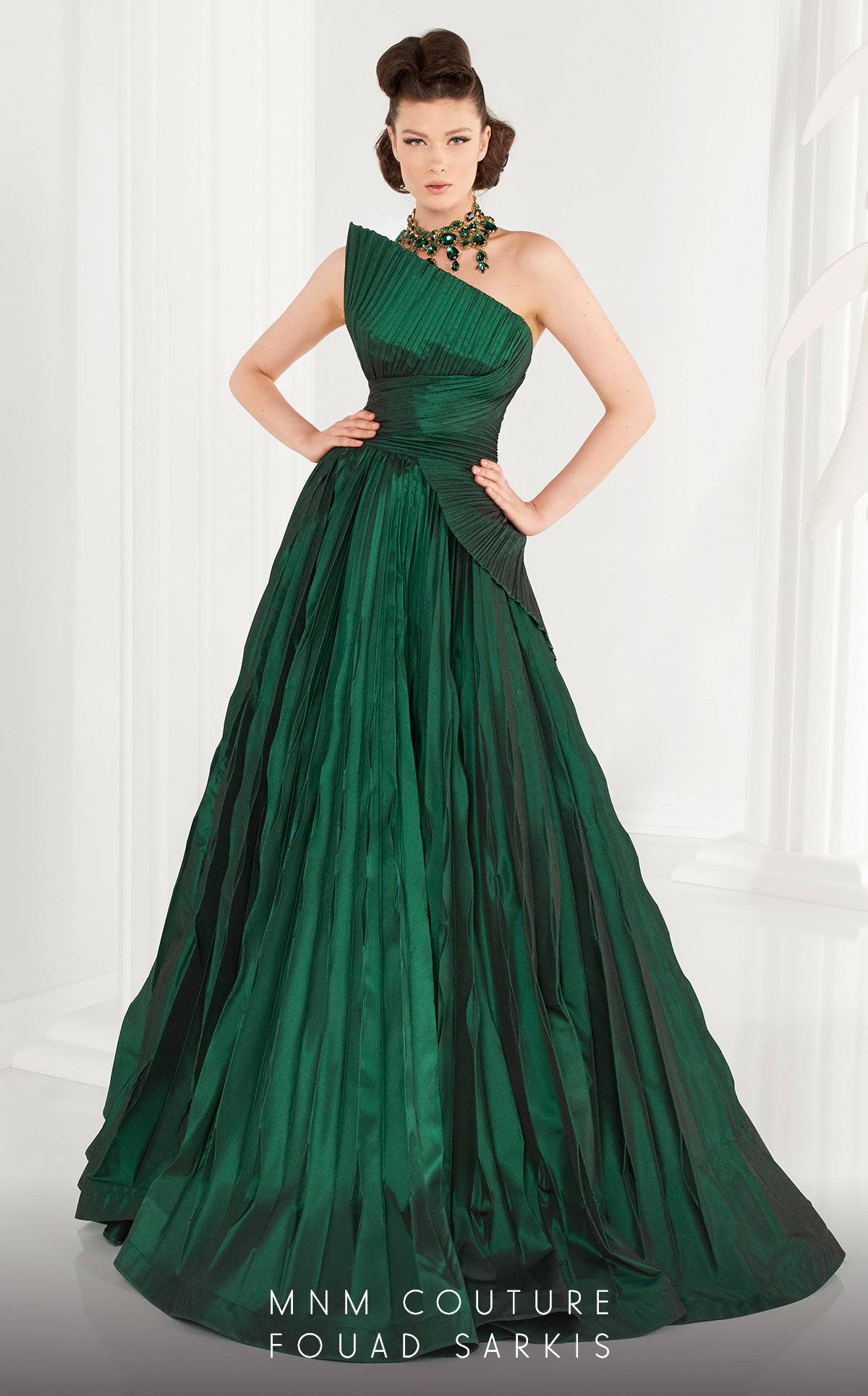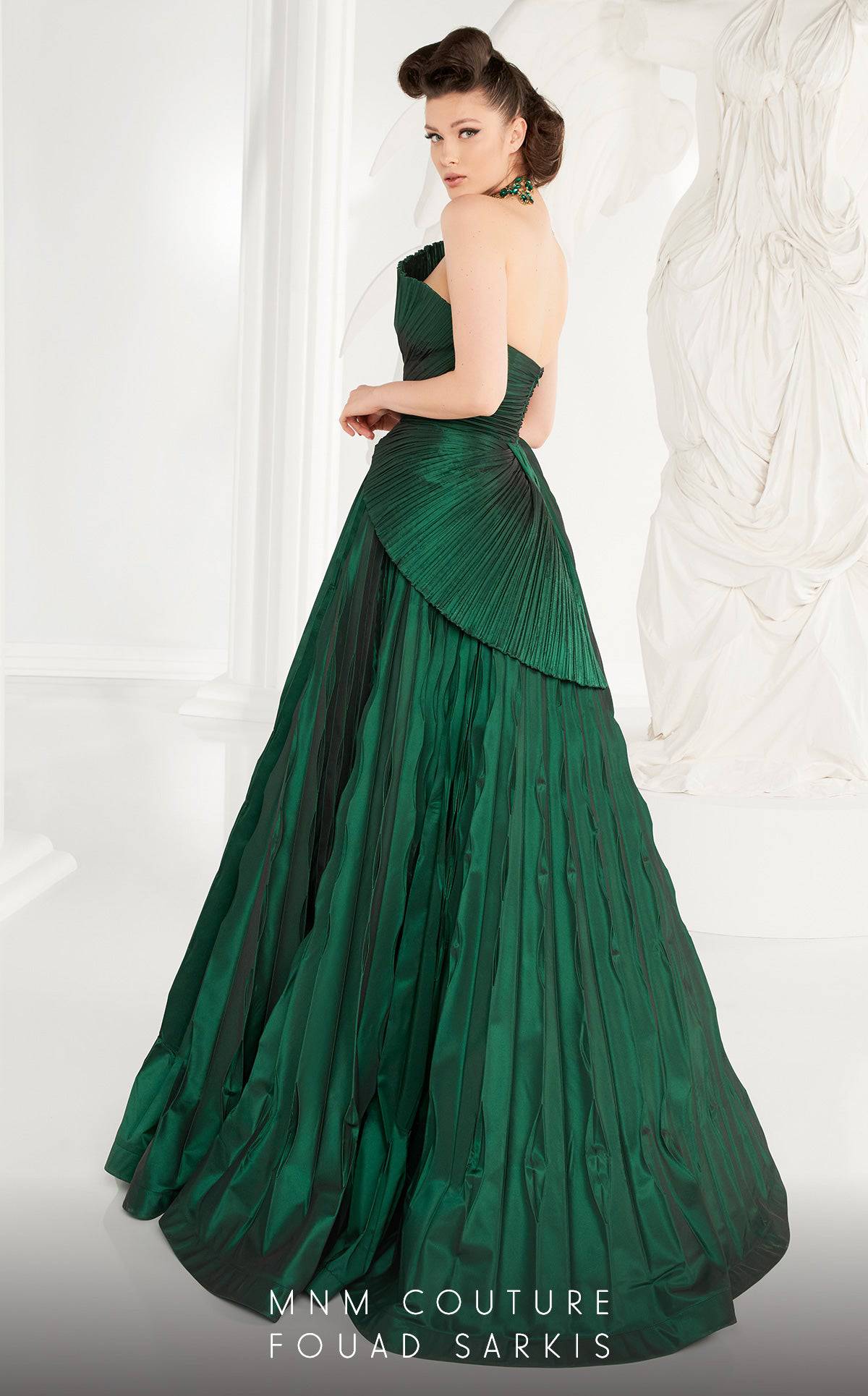MNM Couture 2558 strapless long dress with pleated bodice, triangular-edge detailing and it is cinched at the waist. The pleated A-line silhouette skirt flourishes from the waist and finishes off with the floor-length hem.