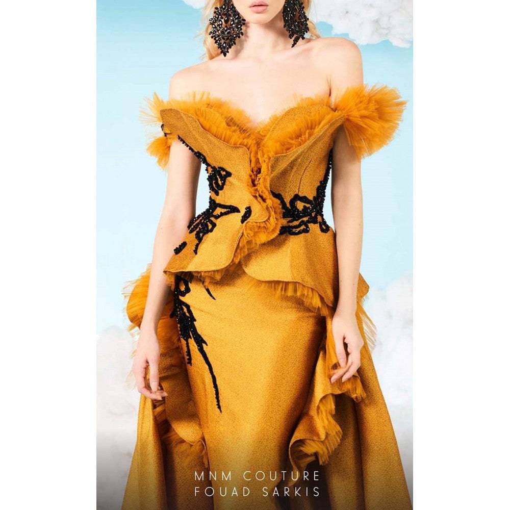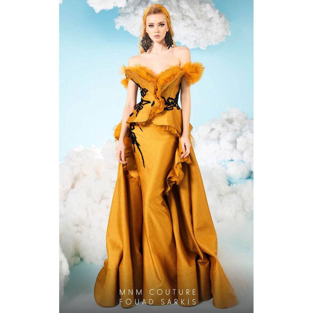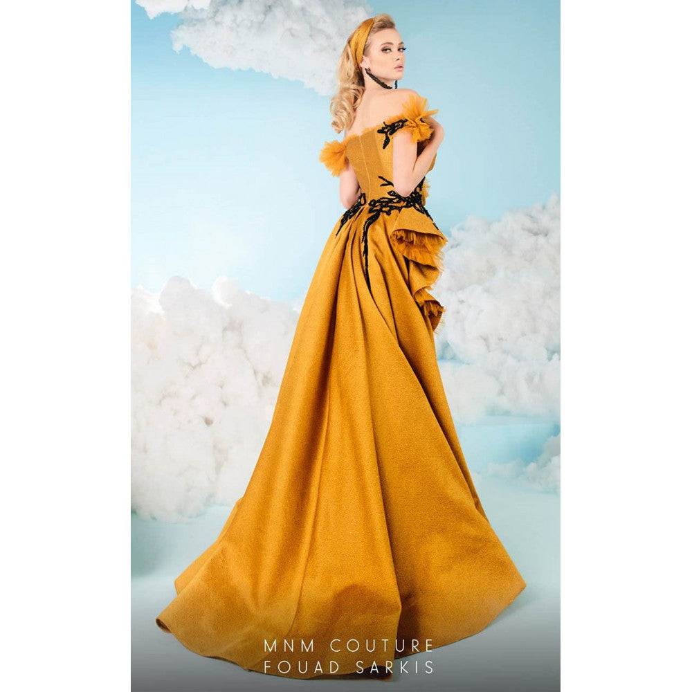 MNM Couture 2640 shimmering mustard feathery off the shoulder long dress.