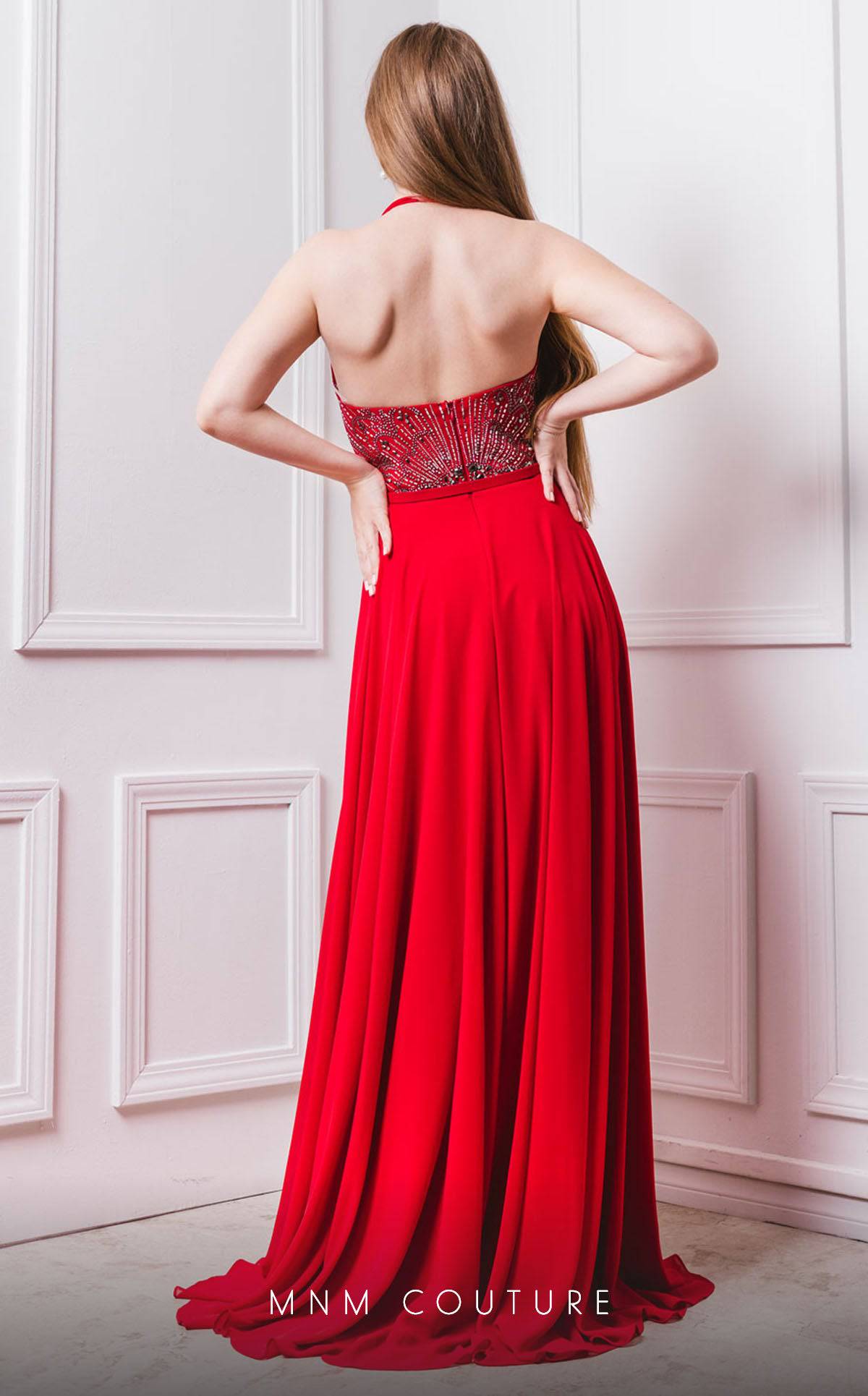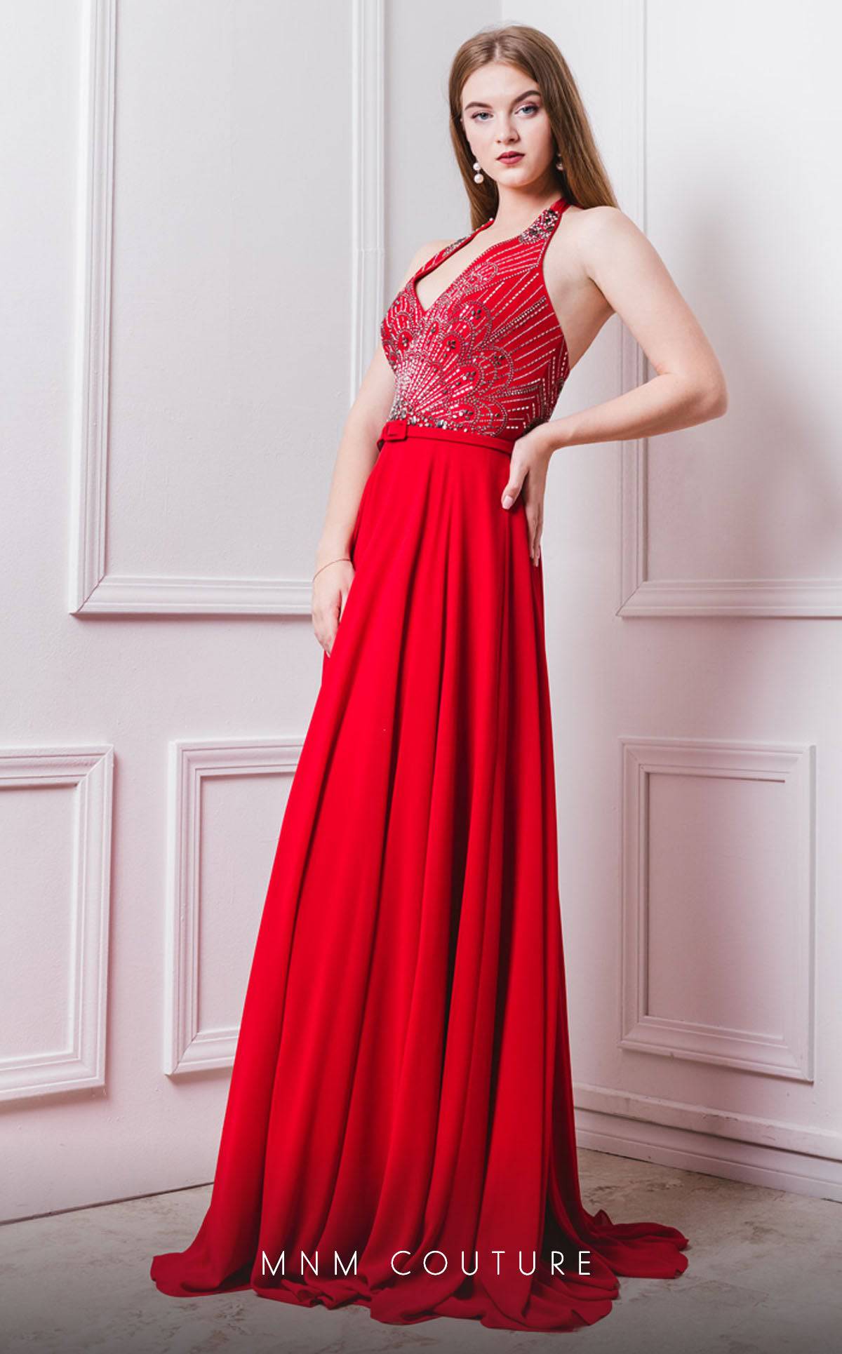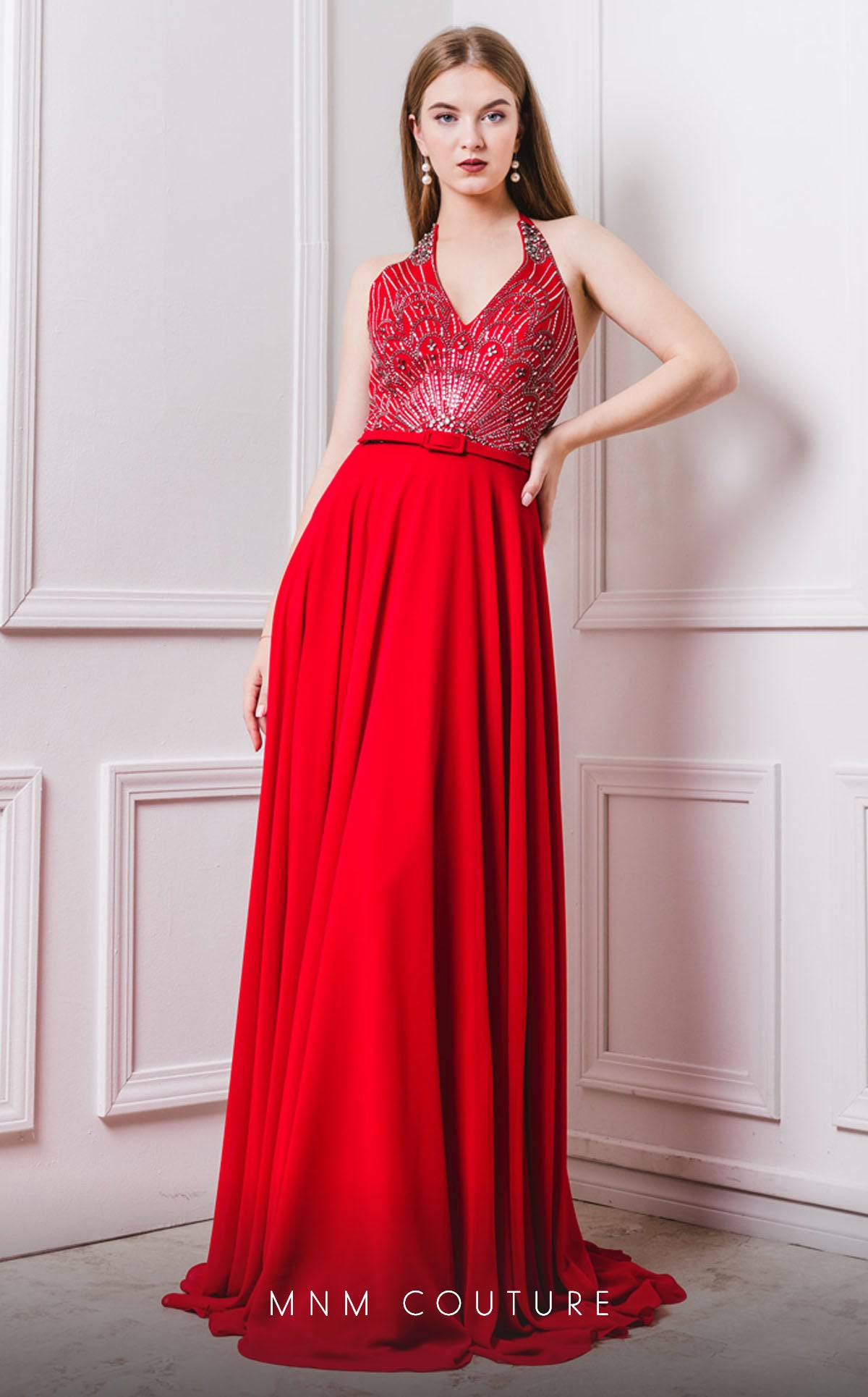 MNM Couture F6198 shimmering with beads red halter long dress. Also available in: Mint, Salmon & Seafoam Green
