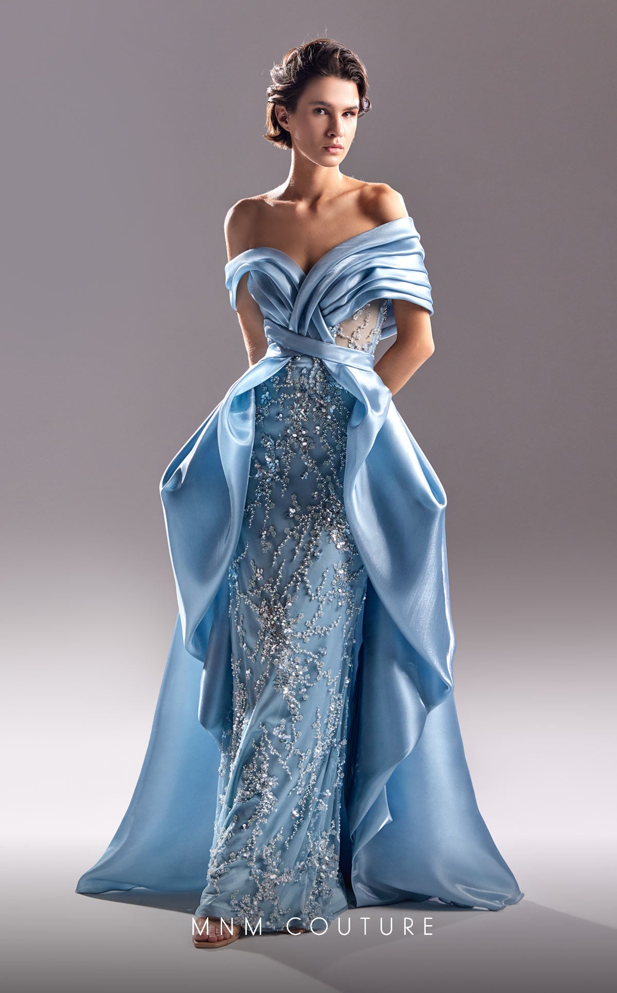 The MNM Couture G1525 is an elegant evening dress with off-shoulder design and an overskirt that adds texture and style. Crafted with luxurious couture fabric, this is a timeless look that will make you the center of attention at any special event.