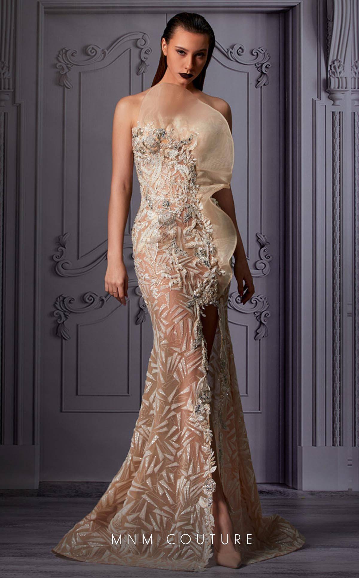MNM Couture K3840 beaded and embellished beige strapless long dress with high slit.