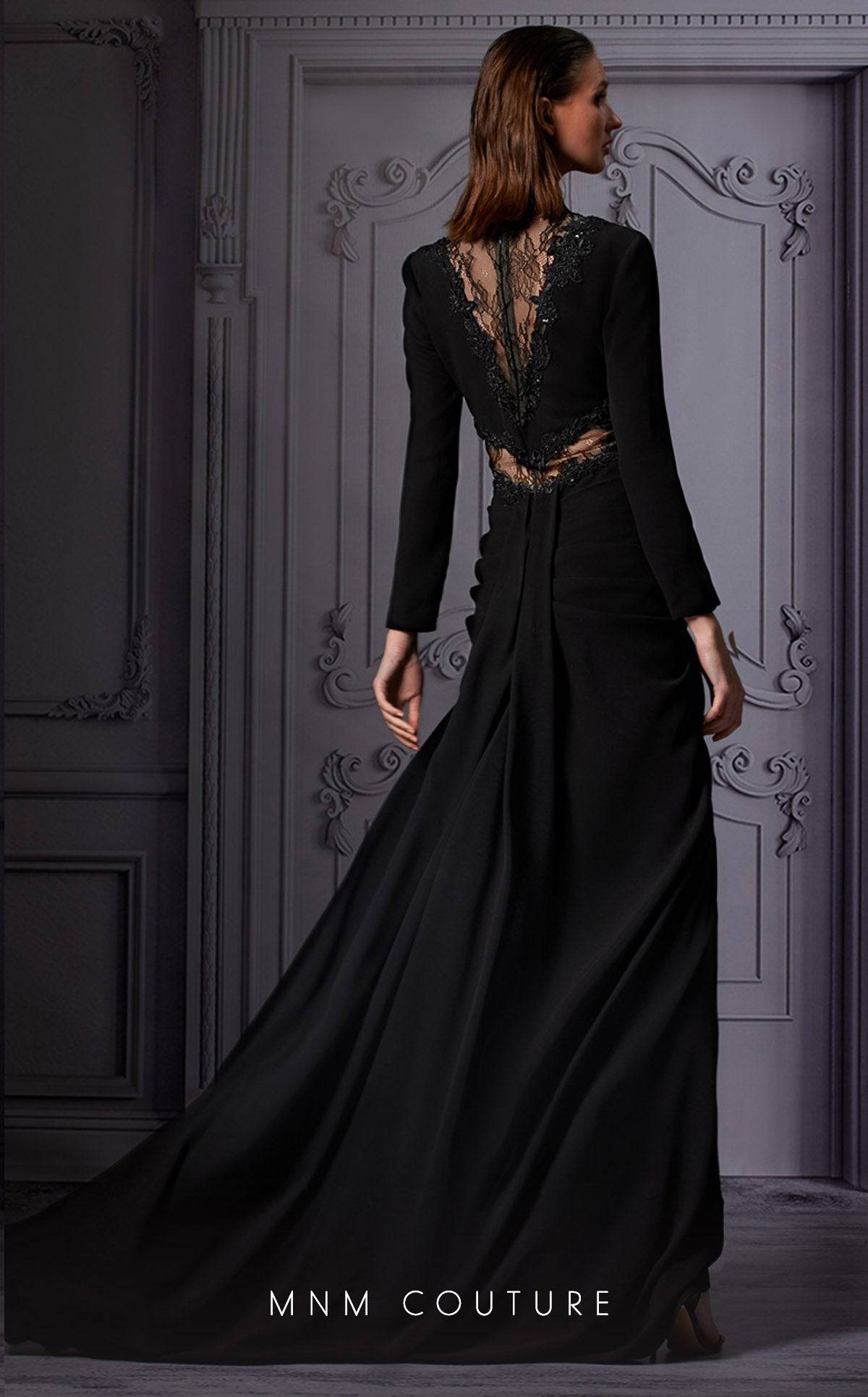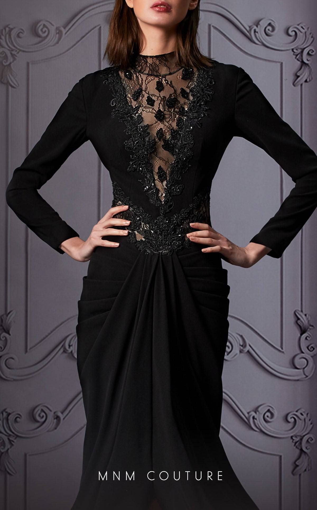 MNM Couture K3848 beaded black long sleeve long dress with front slit.