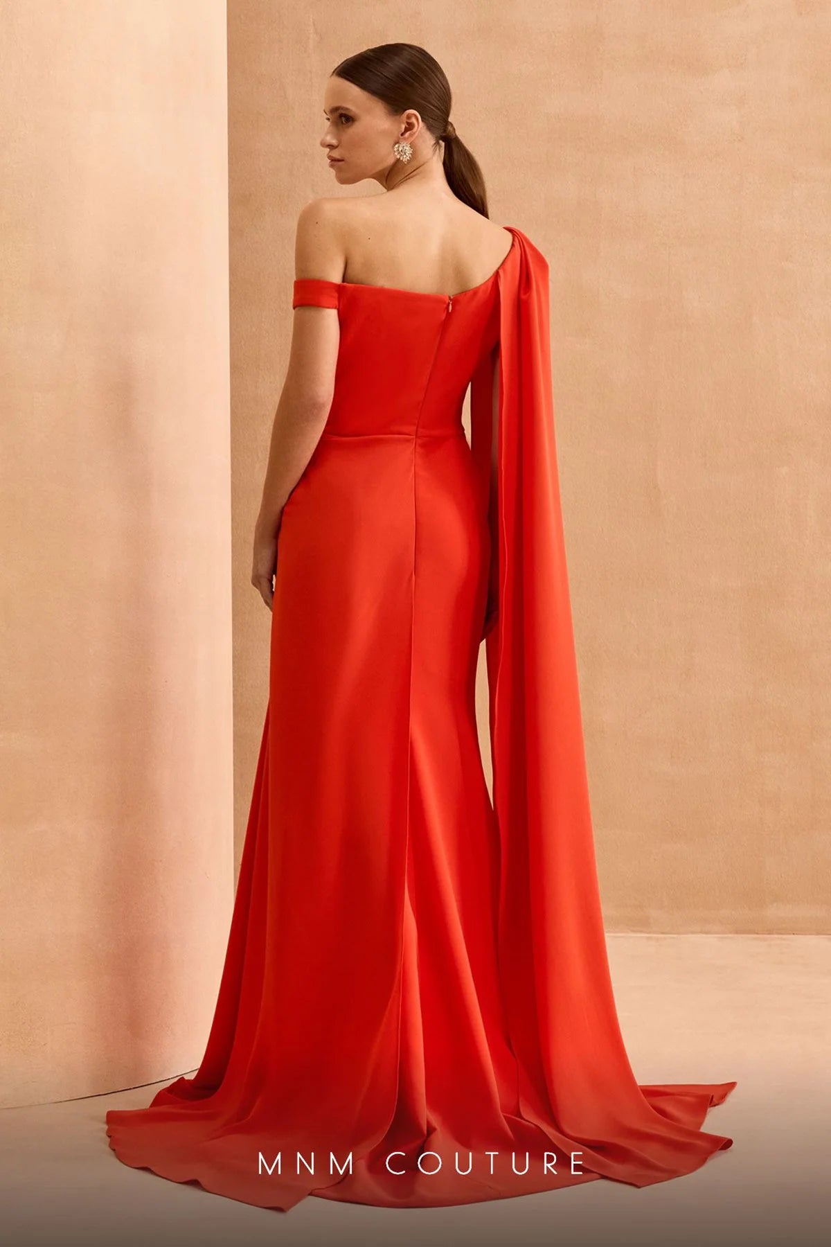 The MNM Couture V02029 is a stunning rayon crepe gown designed to highlight elegance and sophistication. Its asymmetrical one-shoulder sleeves and sleek column silhouette create a flattering fit, while the long cape skirt adds dramatic movement. A brooch adorned with crystals, rhinestones, and beads cascades from the waist to a daring knee-high side slit, offering a refined yet bold statement. Ideal for those seeking a luxury couture dress with distinctive style, this gown ensures you command attention at any event.