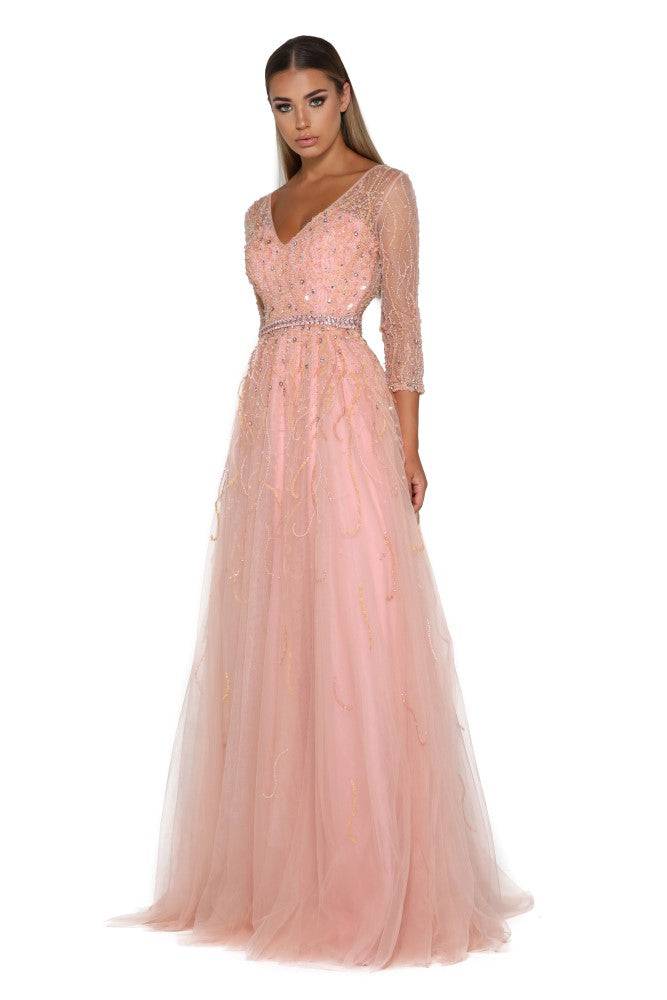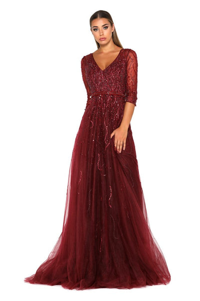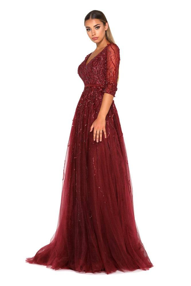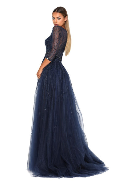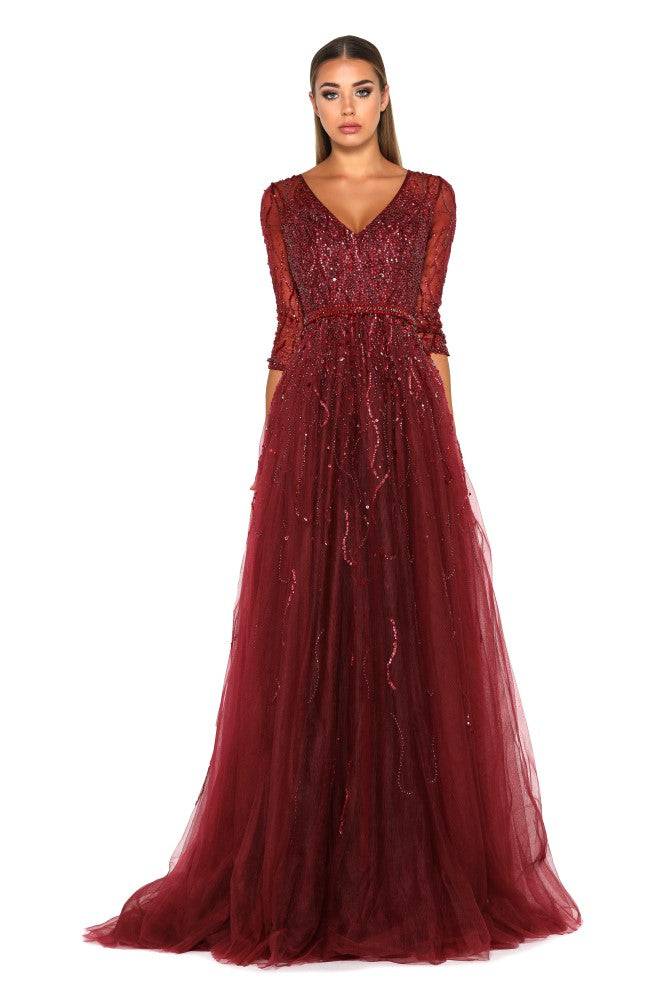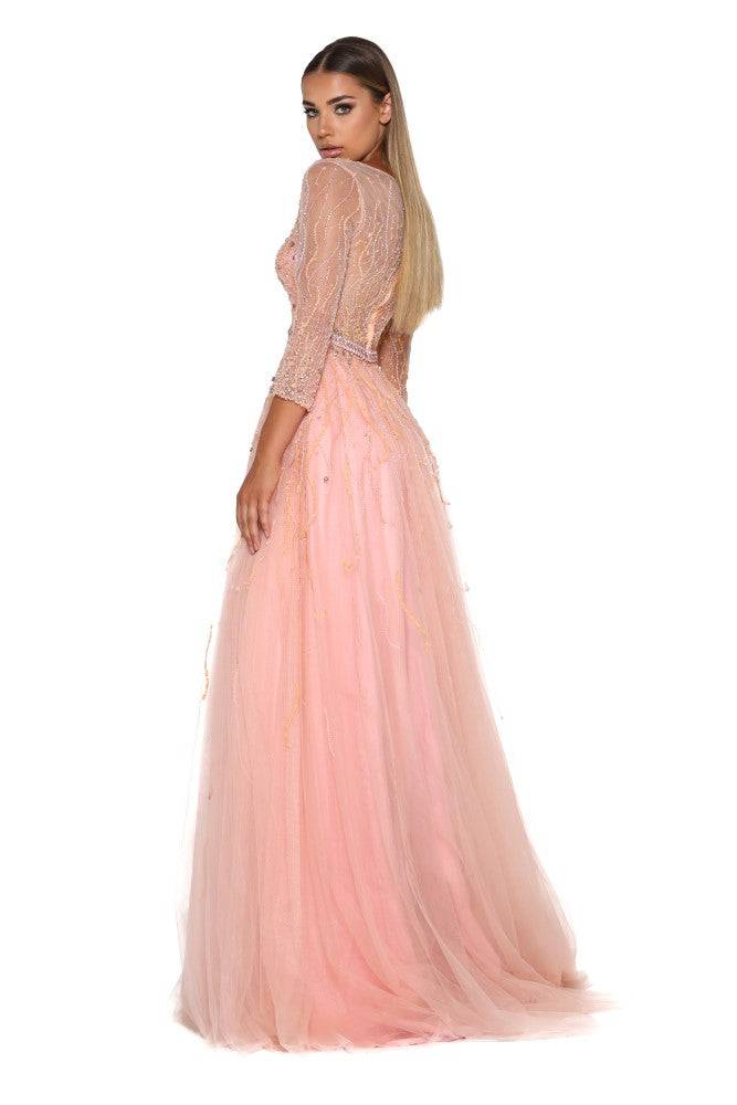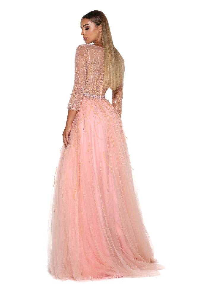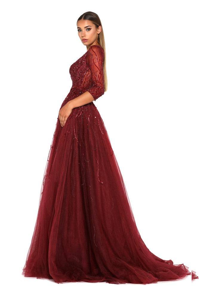 The 1799R is a full length A-line gown with a V-neck front and a closed sheer back. It has three quarter sleeves, a thin, beaded waist belt and full tulle skirt. The bodice, sleeves and skirt are beaded.