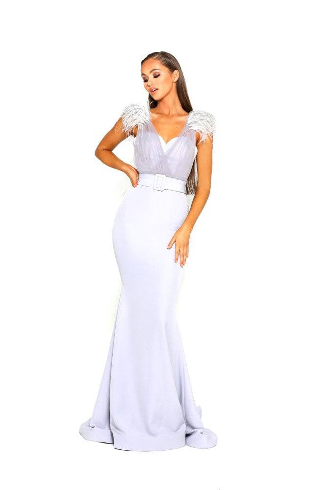 PS1984 is a modernised version of the classic bridesmaids style the Melissandre Gown. It has the same meshed bodice, however this time, it is designed as V front mesh with ostrich feathers on the shoulders and a thick waist belt.