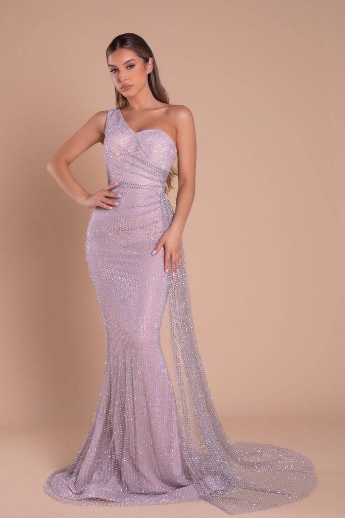 Portia & Scarlett PS21106 stone ab sequin beaded sweetheart neckline and one shoulder long dress.