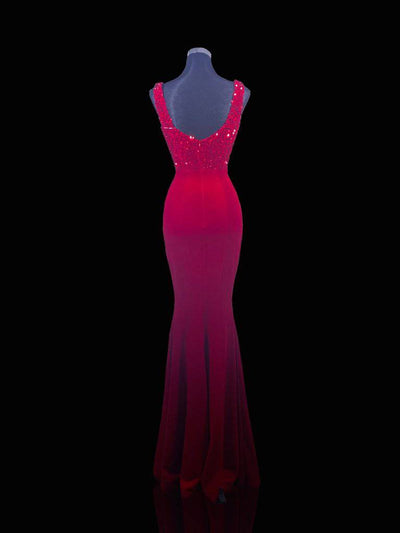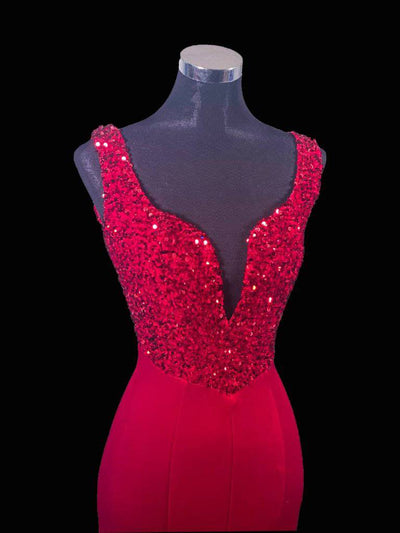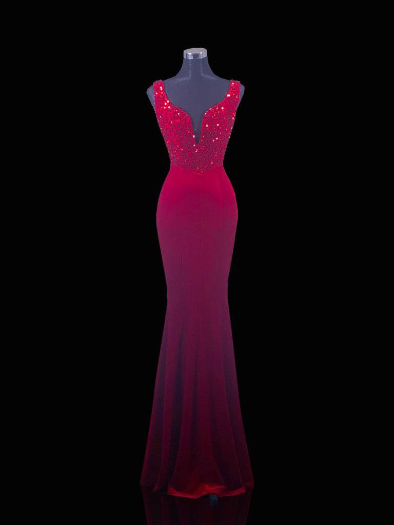 Portia & Scarlett PS21316 shimmering with beads red sleeveless long dress.