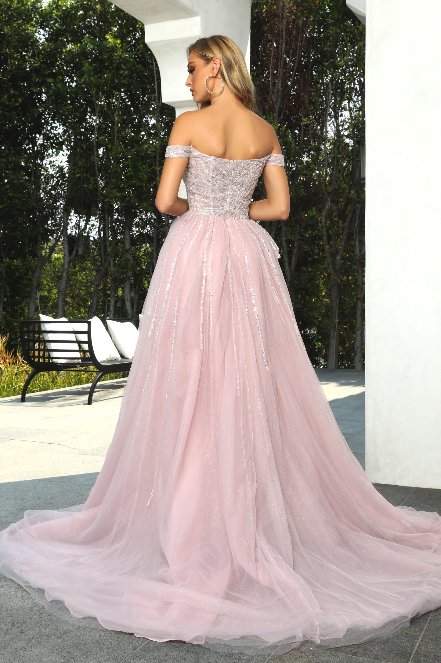 Portia & Scarlett PS22929 This stunning dress features an off the shoulder design in a sweetheart neckline and a closed back adds structure to your defined shoulders. The ruched details on the waist showcases a natural waistline. The A-line tulle flourishes along with the column silhouette and a thigh-high silhouette to flaunt your sexy legs.