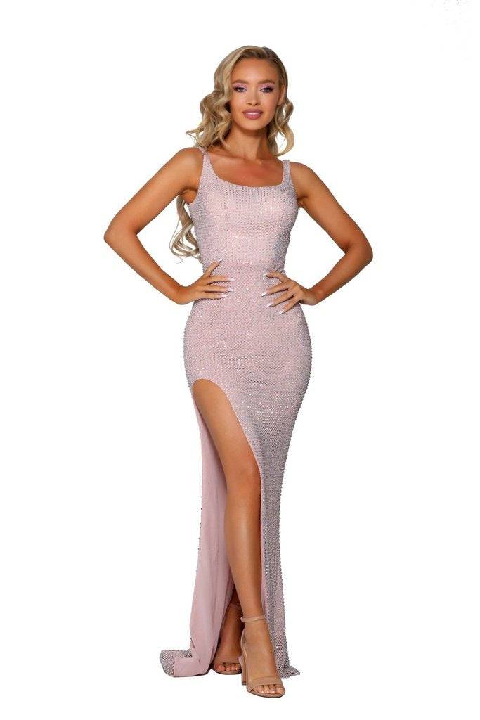 Portia & Scarlett PS6327 Pink fully beaded fit sleeveless with leg slit. Also available in: Blush & Platinum.