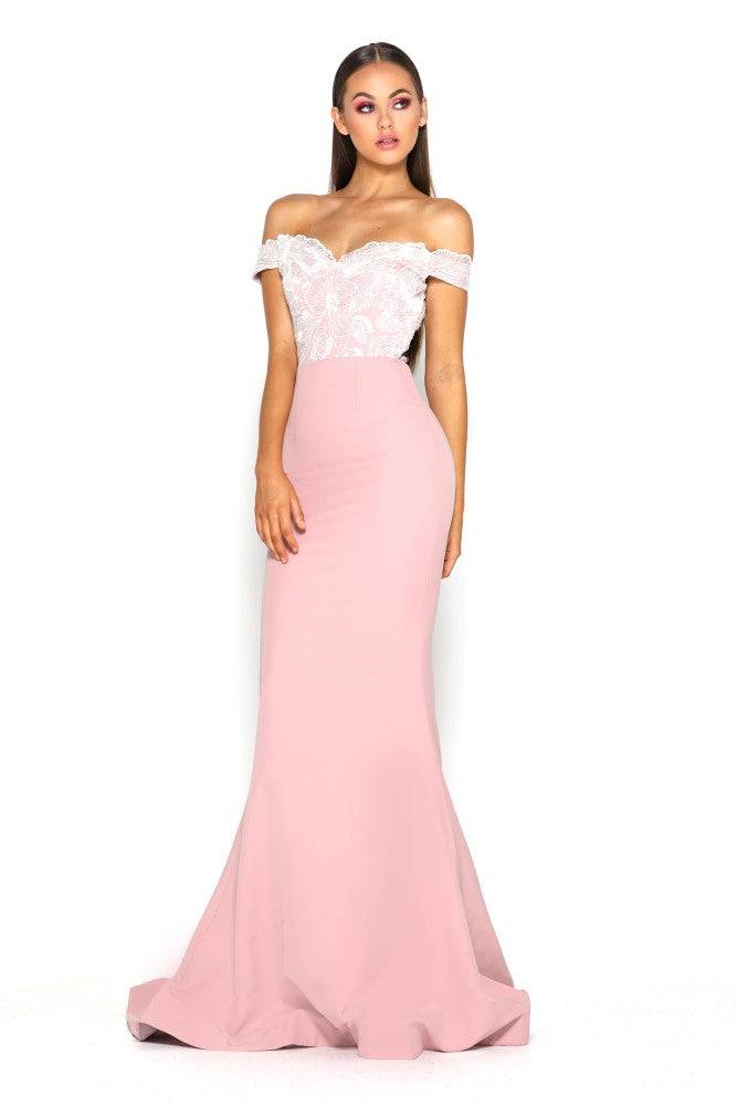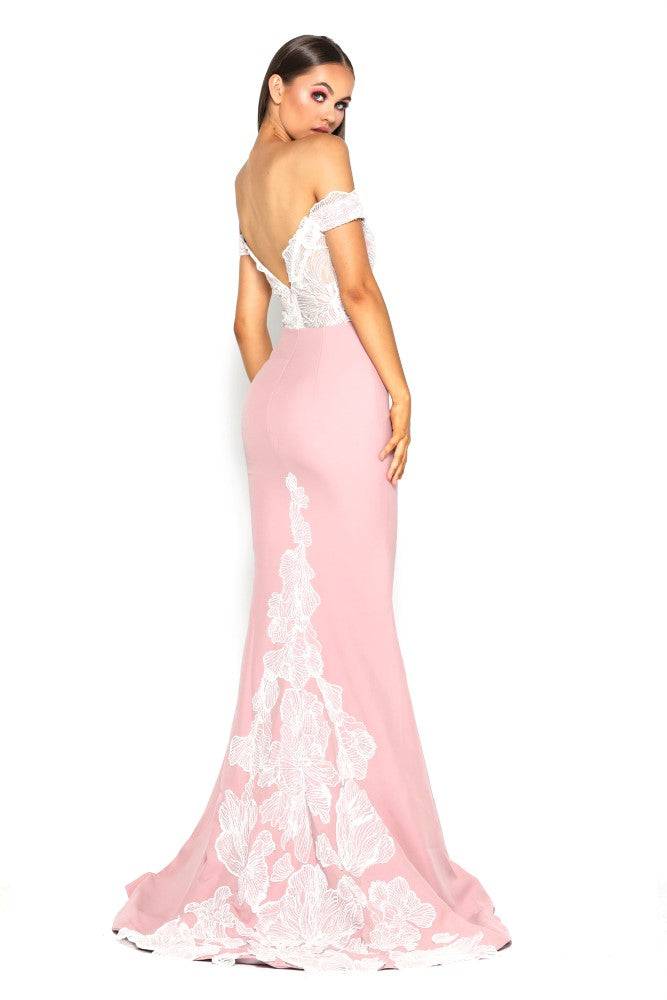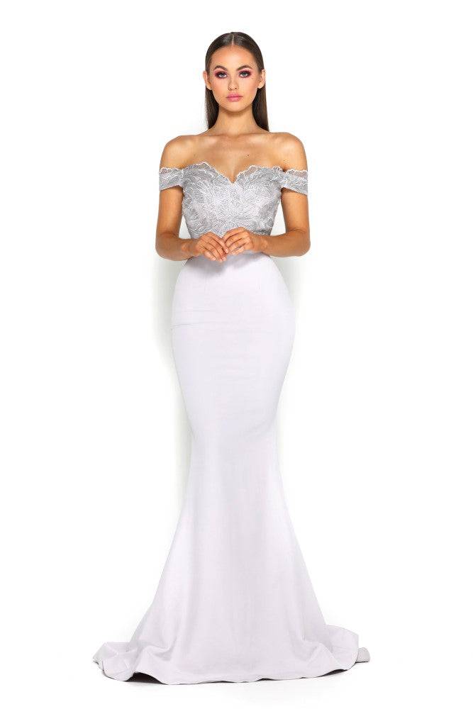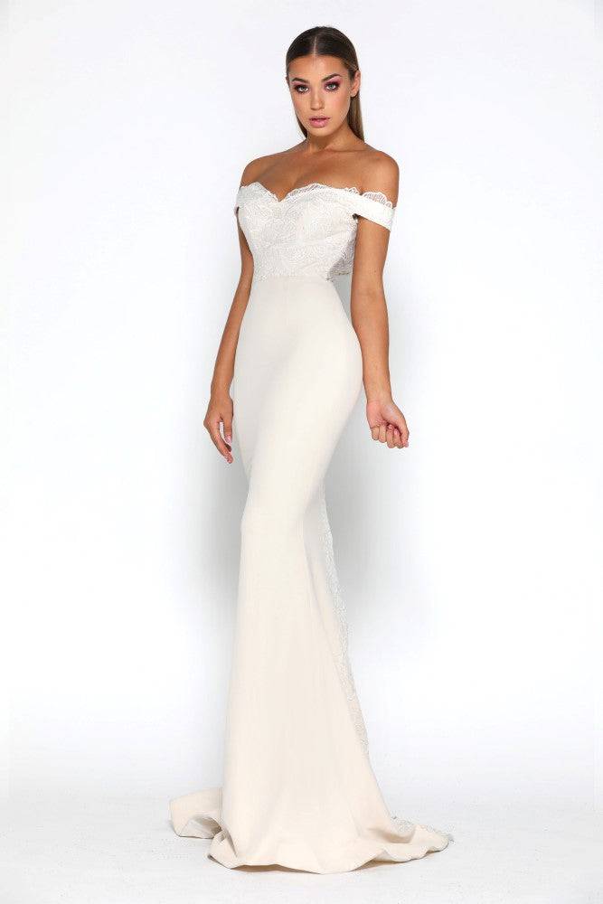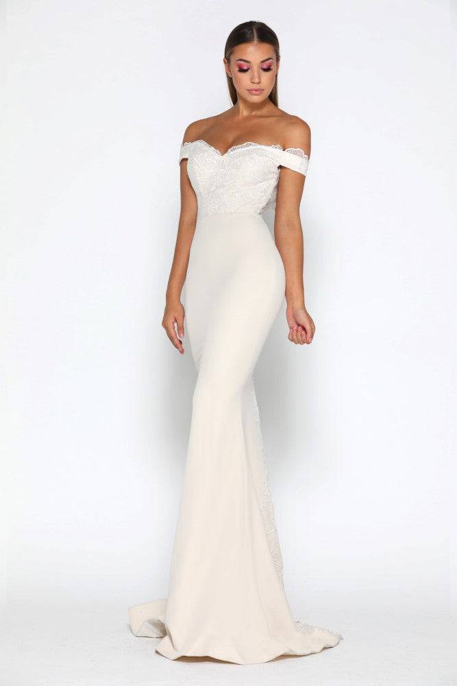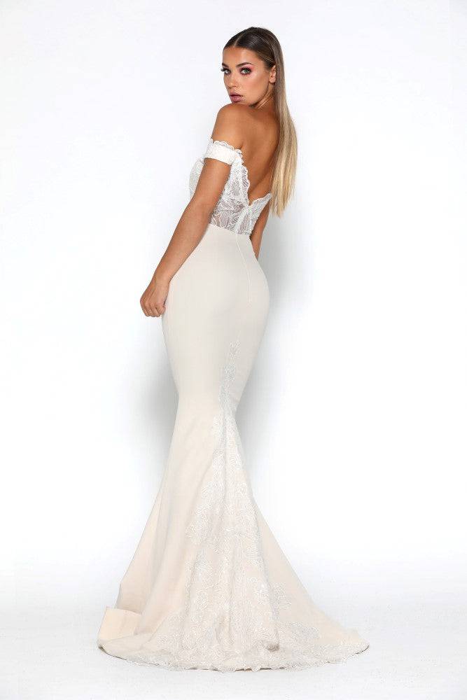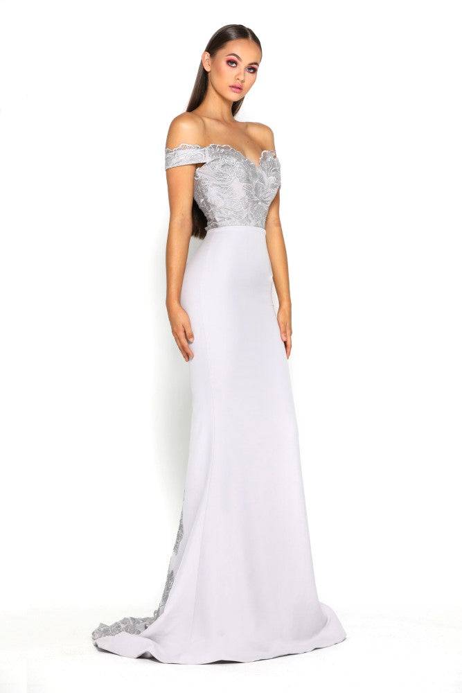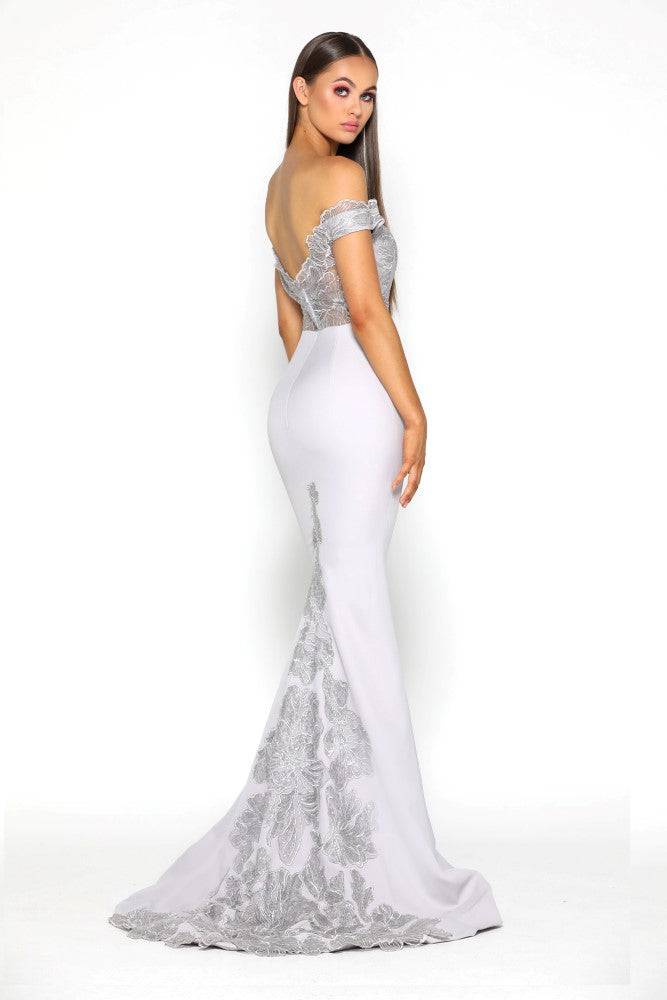 Signature Portia & Scarlett fit, the Snow Gown has a patterned illuminated sequin lace bodice with scalloped off shoulder straps and a sheer back. The gown has buttons along an invisible centred zip. The skirt of the gown has a lace applique train. The Lace is an embroidered lace with shimmer sequin clusters.