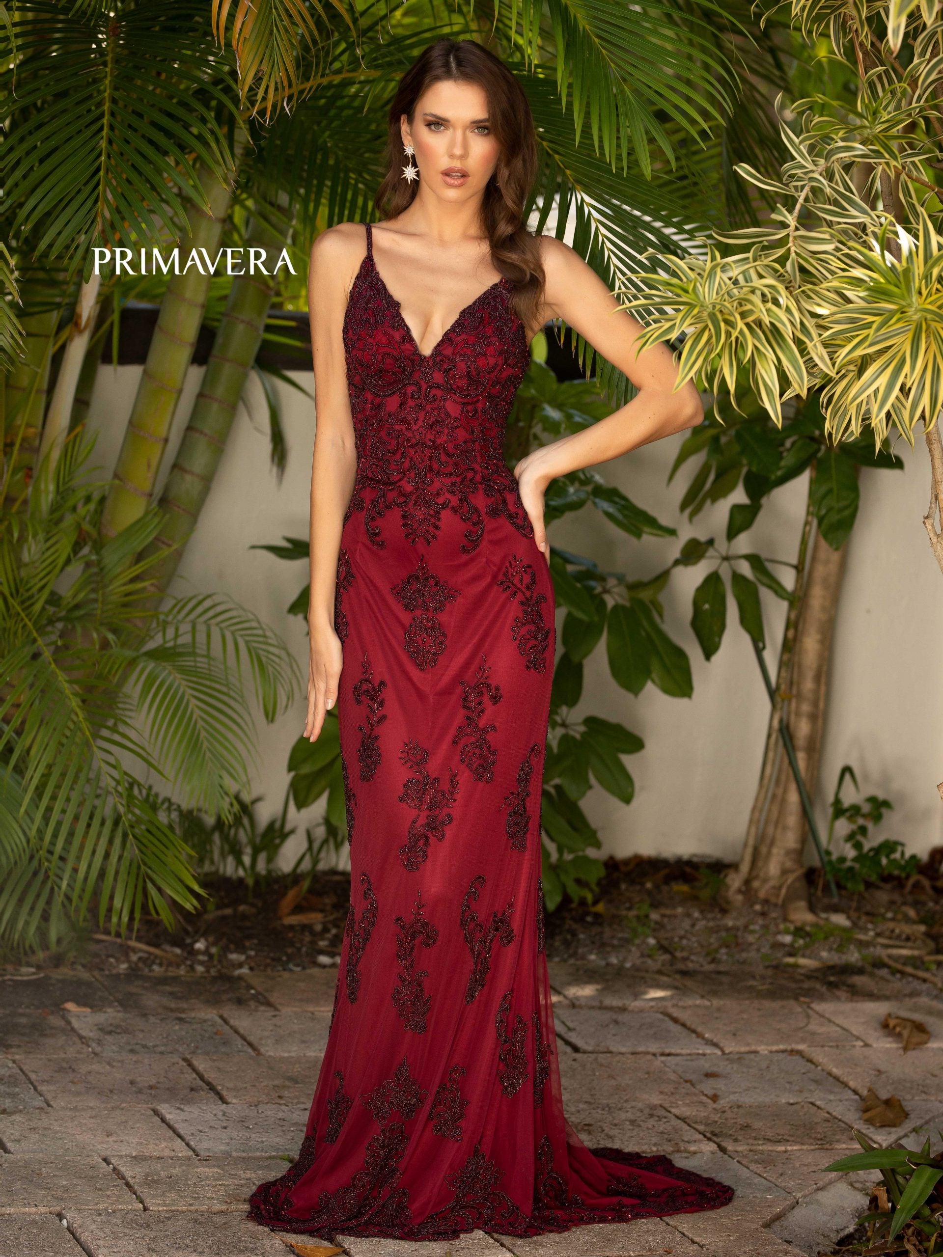 Primavera Couture 11046 This sleeveless bodice showcases a natural waist and a curve-kissing look. Adorned in glitter accents the dress shows lovely embroidered patterns. The dress features a V-neckline, spaghetti straps and an open back with zipper closure.