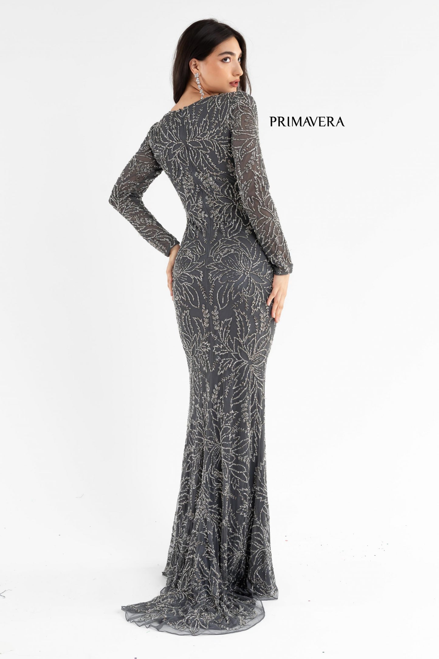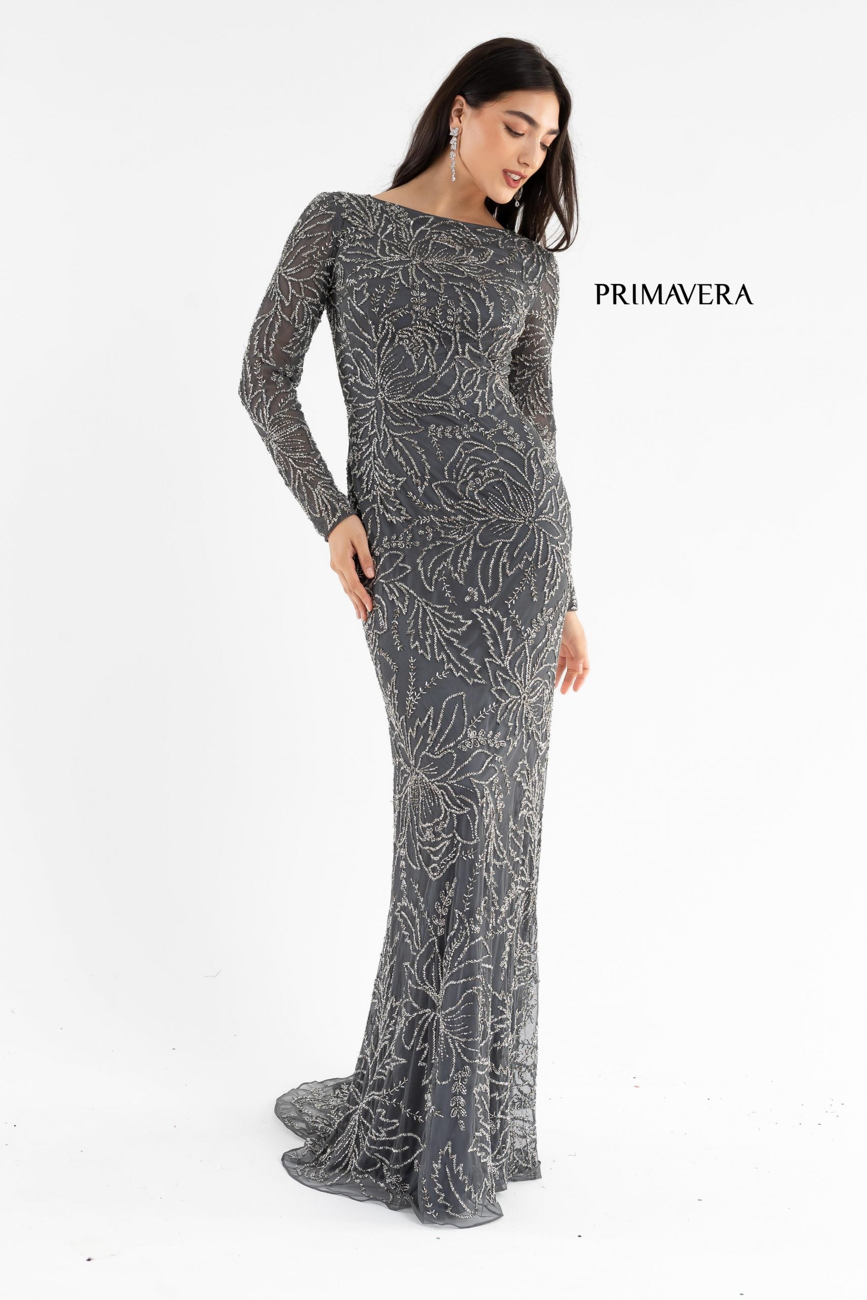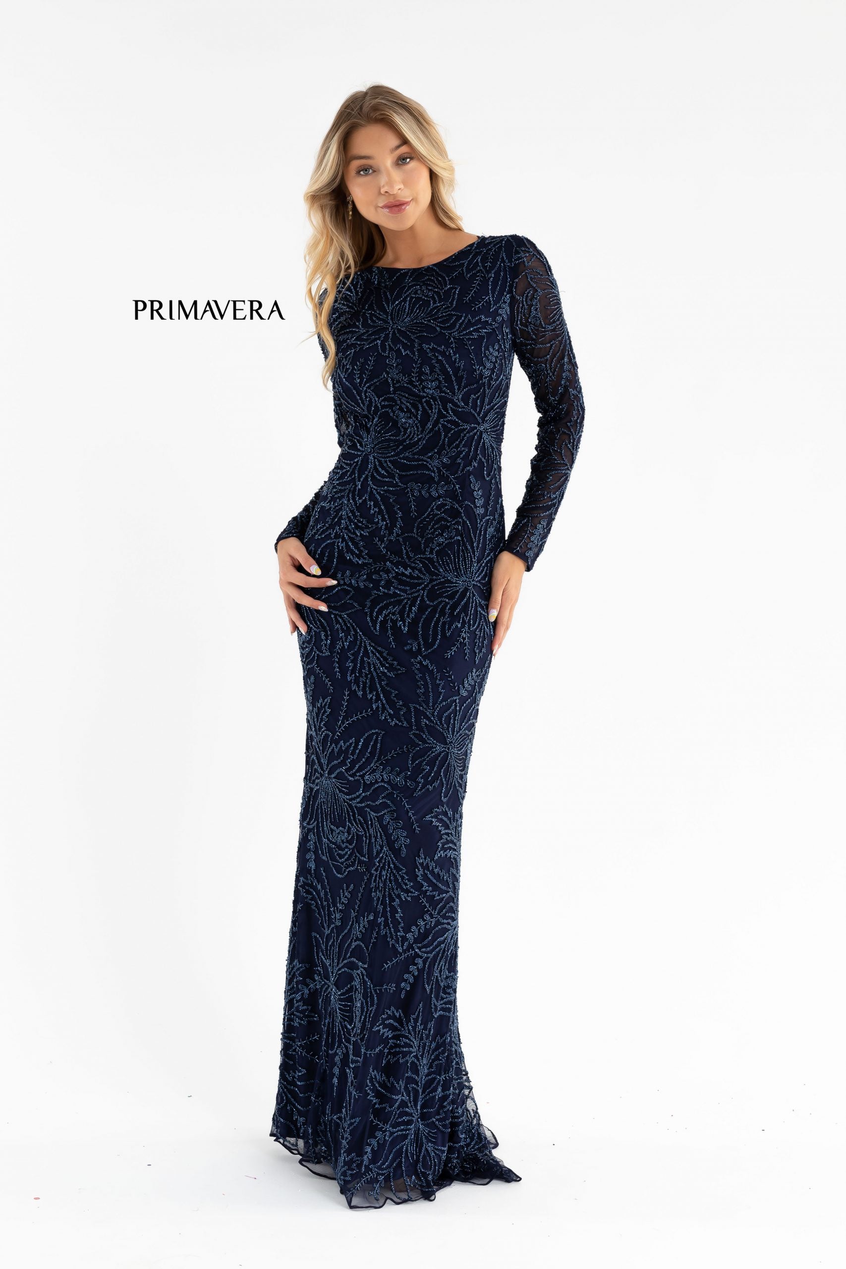Primavera Couture 11054 alluring long dress. The fitted silhouette is ultra flattering and showcases captivating beadwork throughout. The high neckline flows into sheer long sleeves and a centered zipper back closure. Show off the ravishing sweep train as you exit.