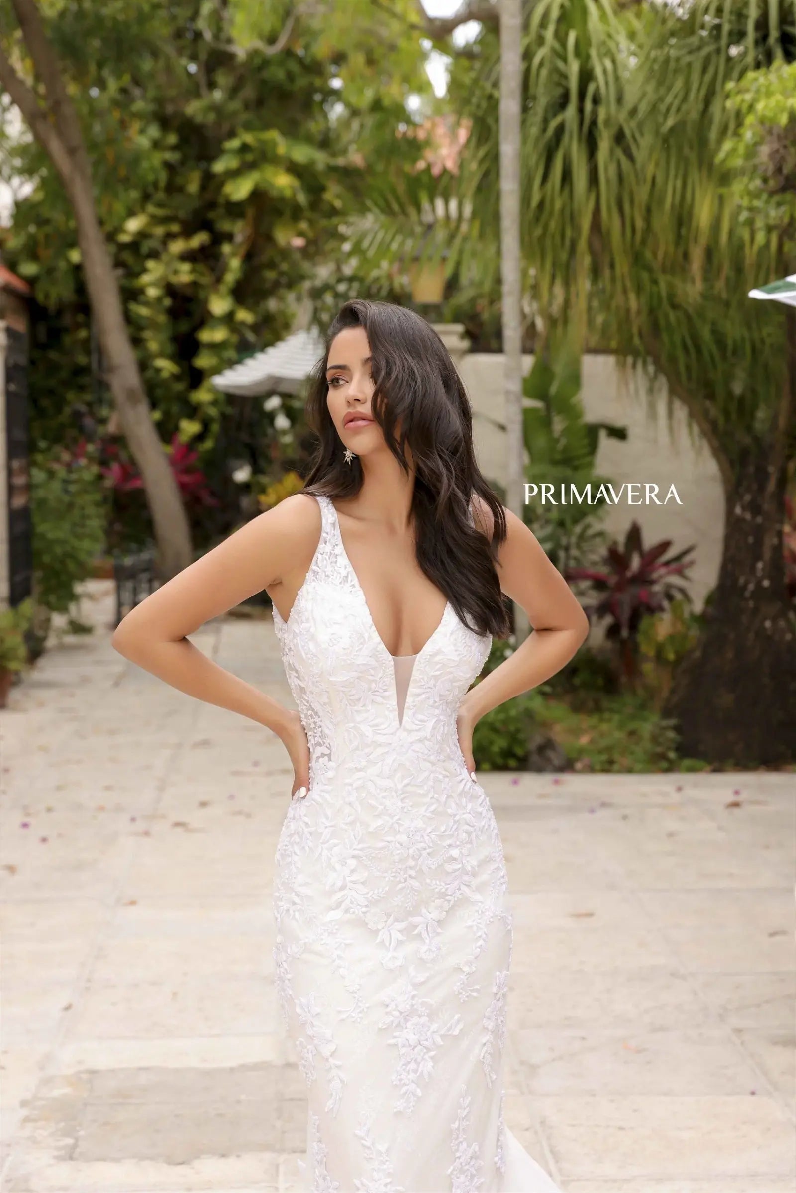 Say "I do" in the radiantly romantic Primavera Couture 11109! This timeless bridal gown features a plunging V-neckline and sleeveless silhouette, all adorned with floral appliqués for a delicate feminine touch. Unforgettable and forever chic.