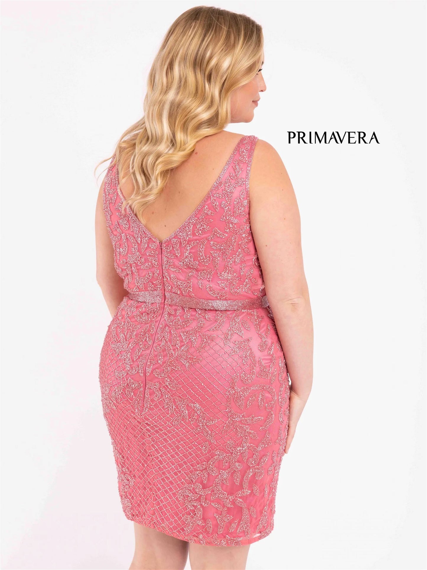 Primavera Couture 3884 Steal the show in this dazzling Primavera Couture short dress. Crafted with intricate beadworks all throughout its length, this beauty shows off in a deep V-neckline and paired with equally sexy V-shaped back and it is secured with a zipper closure. A nip on the natural waist with the embellished waistband flatters your curves elegantly while the skirt forms in a sheath and ends in a short hemline.