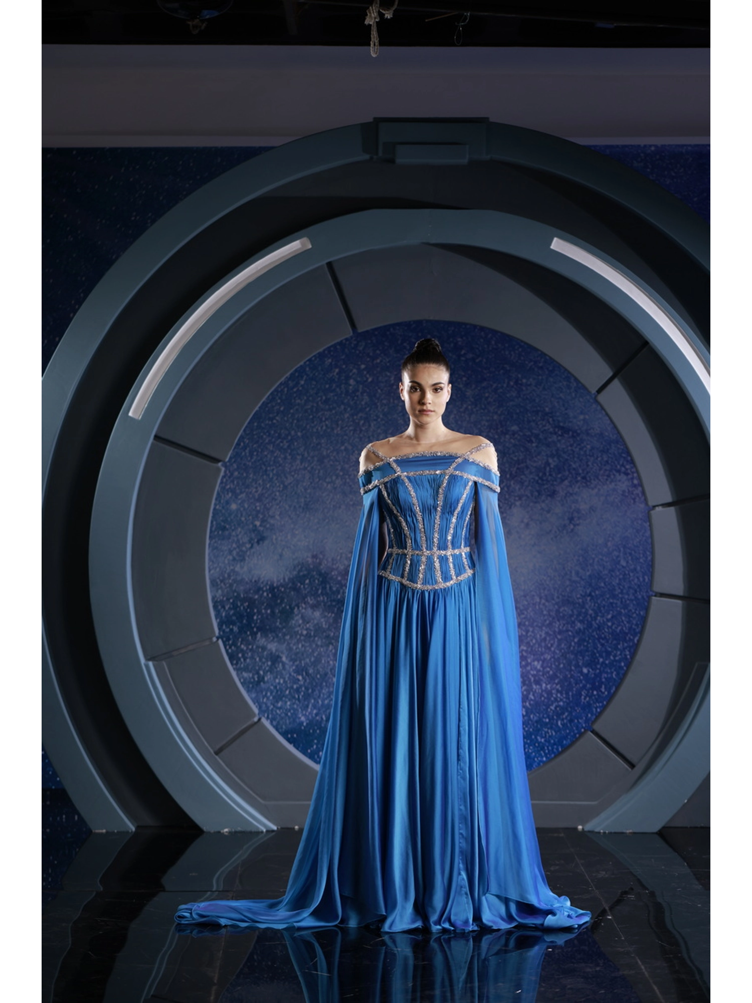 This mousseline blue dress features an elegant off-the-shoulder design complemented by delicate cap sleeves. Its flowy skirt enhances your silhouette with graceful movement, while silver bead bands on the bodice provide a refined, sparkling accent that elevates the overall sophistication. Perfect for formal occasions, this dress balances subtle embellishment with timeless style.