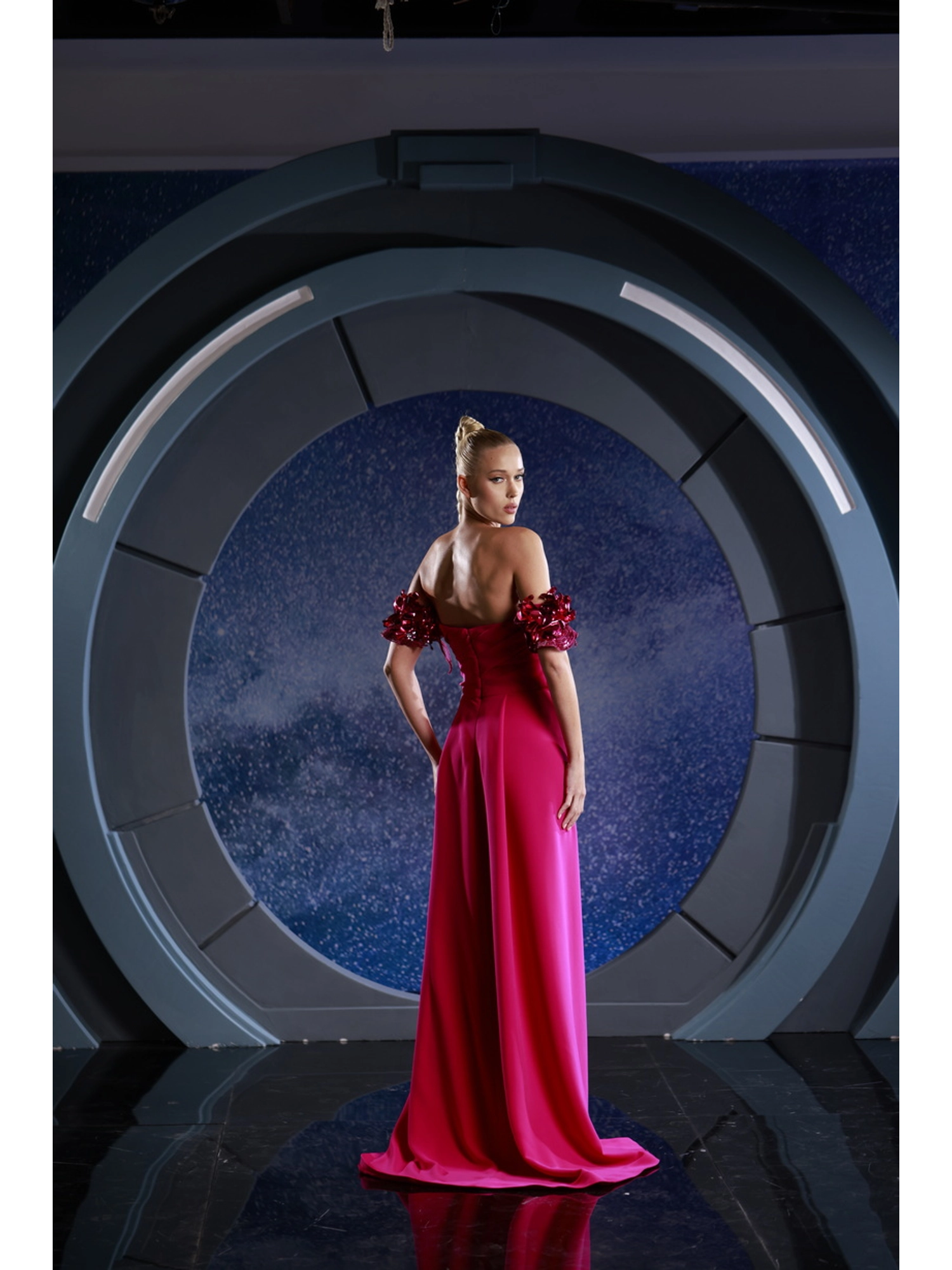 This vibrant fuchsia crepe dress from Reverie Couture features a strapless design with a gracefully draped torso that enhances silhouette definition. Chic cap sleeves adorned with large sequins add a sophisticated touch of sparkle, making this piece perfect for elegant evening occasions. The rich fabric and embellishments combine to create a striking, expert-level statement dress.