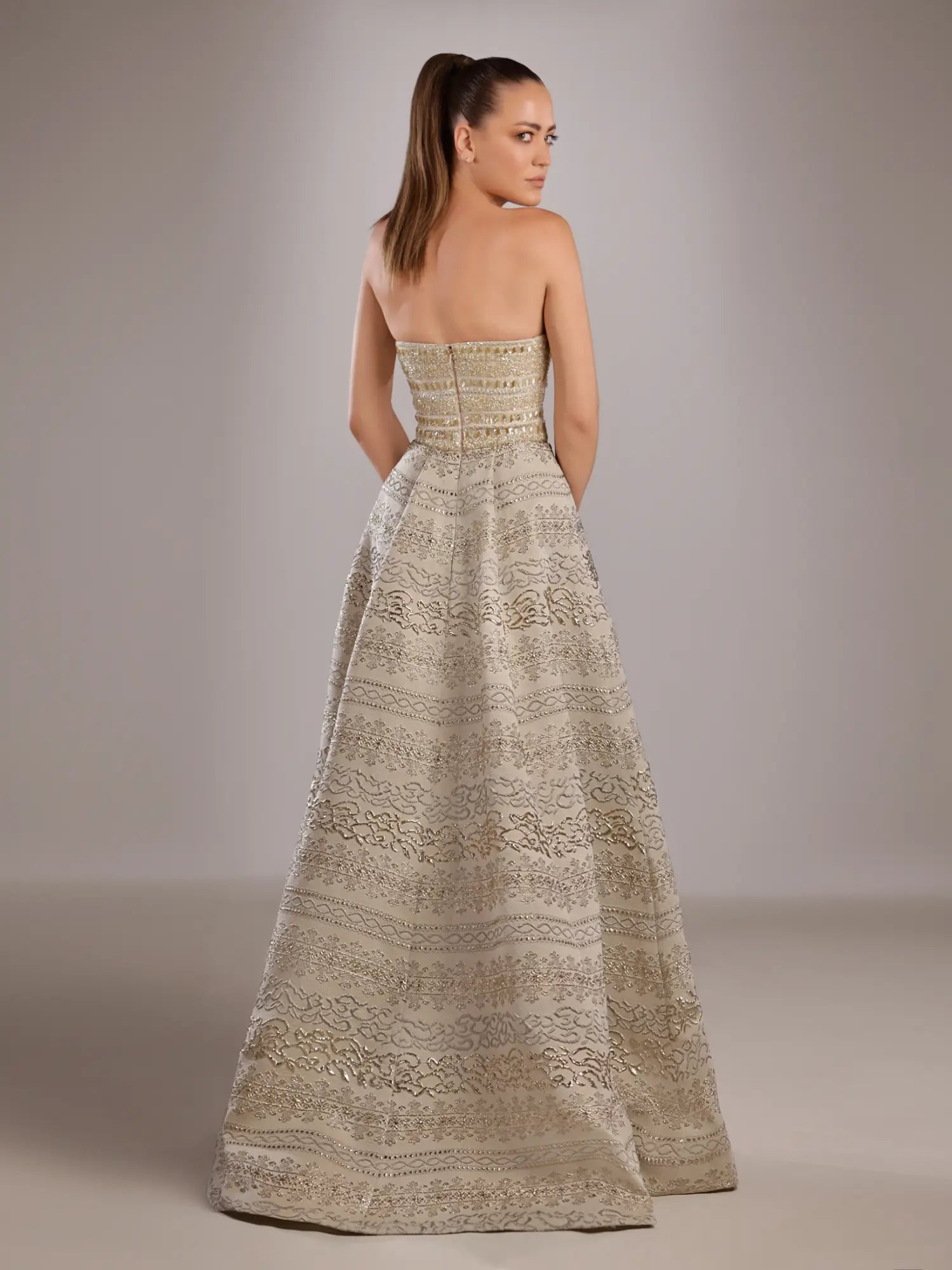 This strapless gold gown features a fully beaded fitted bodice that highlights intricate craftsmanship and elegant detailing. The voluminous A-line brocade skirt adds a luxurious texture and dramatic silhouette, making it a perfect choice for sophisticated evening events or formal occasions. The combination of the richly embellished top and the structured skirt ensures a refined and timeless presence.