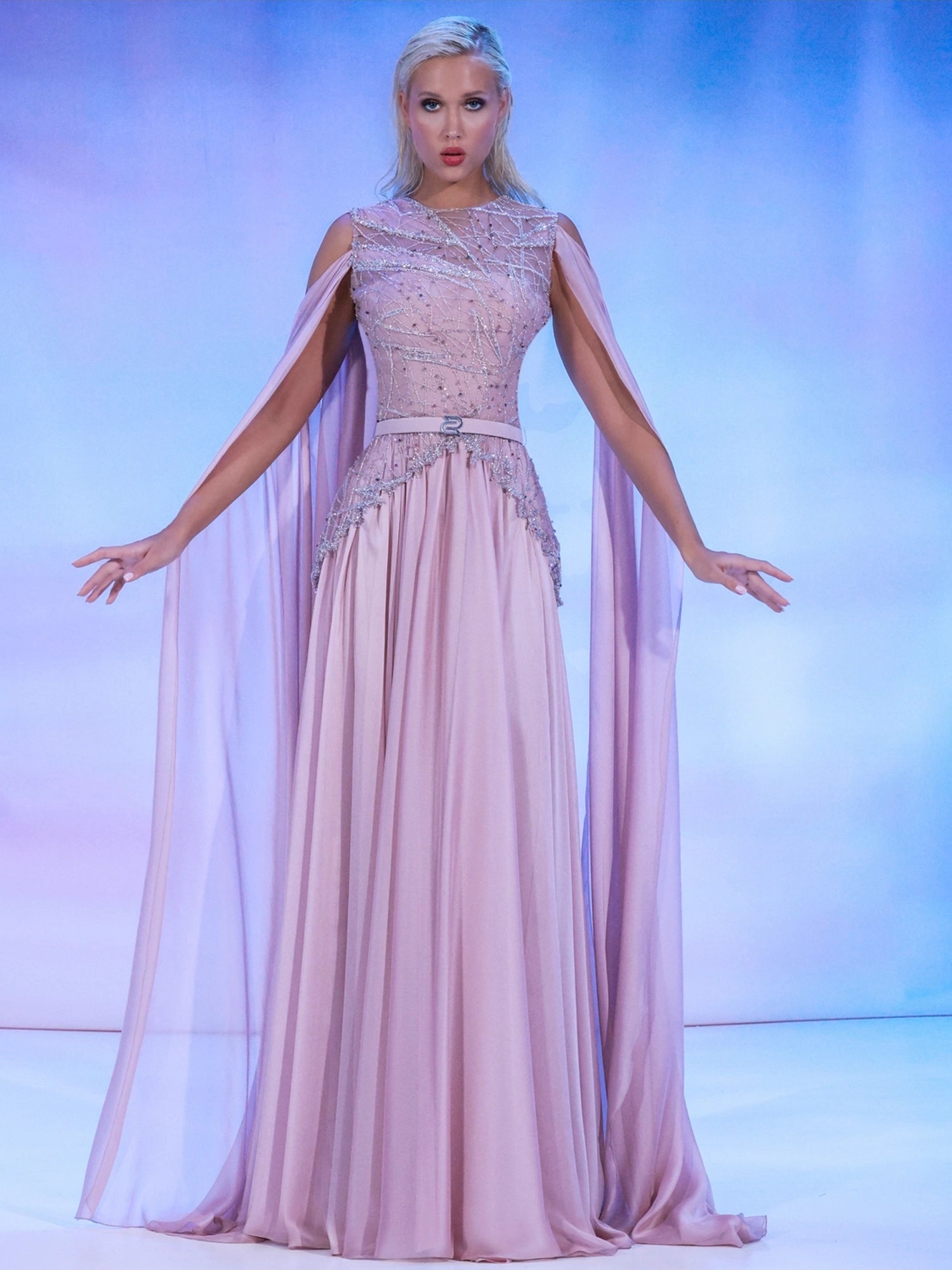 This pink mousseline dress combines elegance and subtle glamour, featuring a flowing skirt that moves gracefully. The round neckline is beautifully detailed with silver and multicolored beading, adding a refined touch. A delicate mousseline cape drapes over one shoulder, enhancing the dress’s sophisticated silhouette and providing a soft, ethereal finish. Ideal for special occasions, this piece offers both visual interest and timeless style.