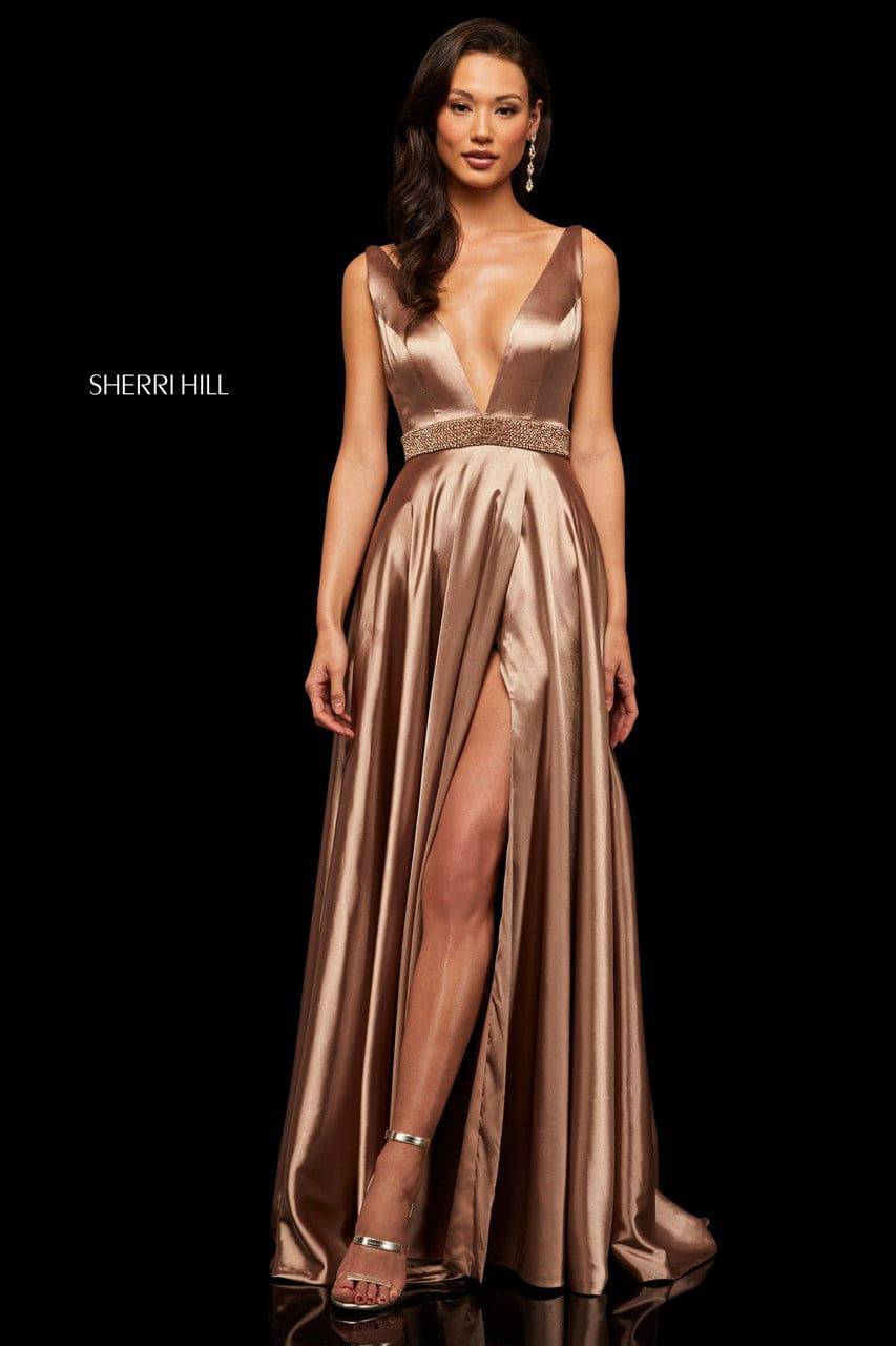 Silk satin dress with plunging neckline, beaded belt, and skirt side slit.