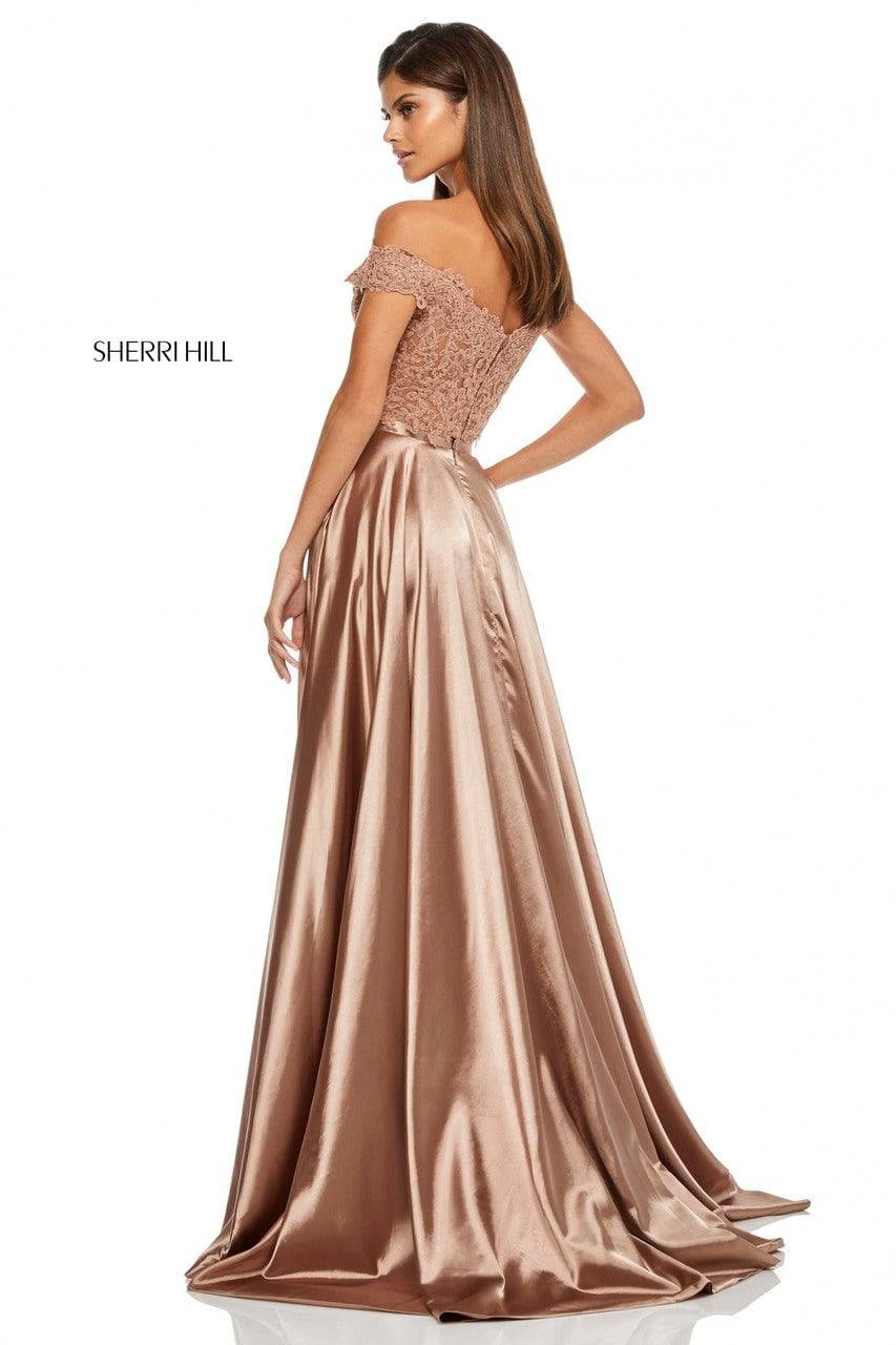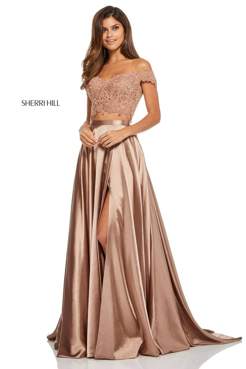 Two-piece lace off-the-shoulder top and satin skirt with side slit.