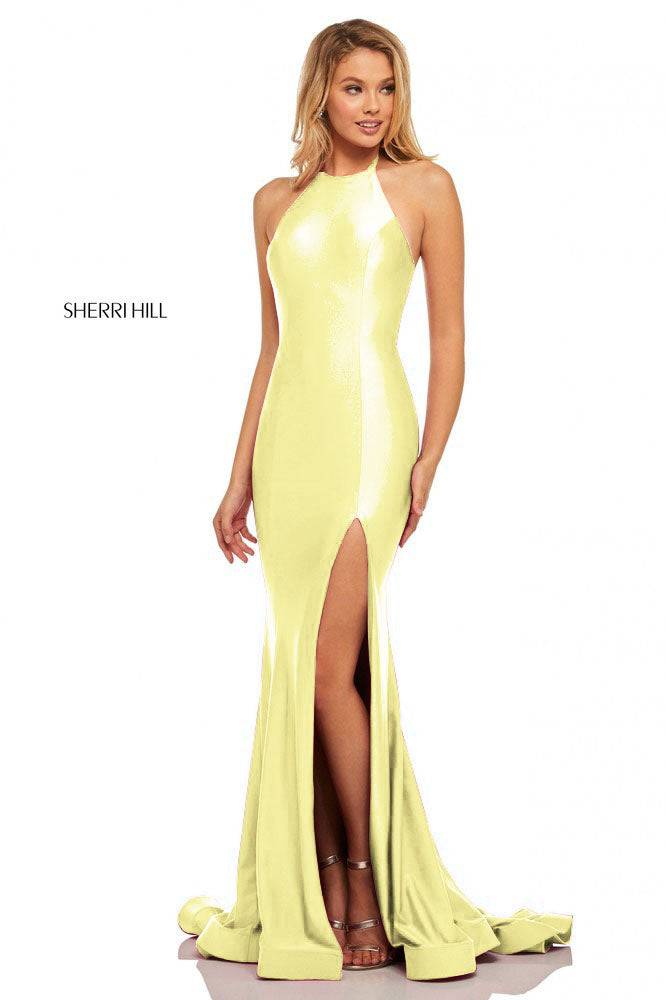 Satin high-neck halter fit-and-flare with slit skirt and cut-out back.
