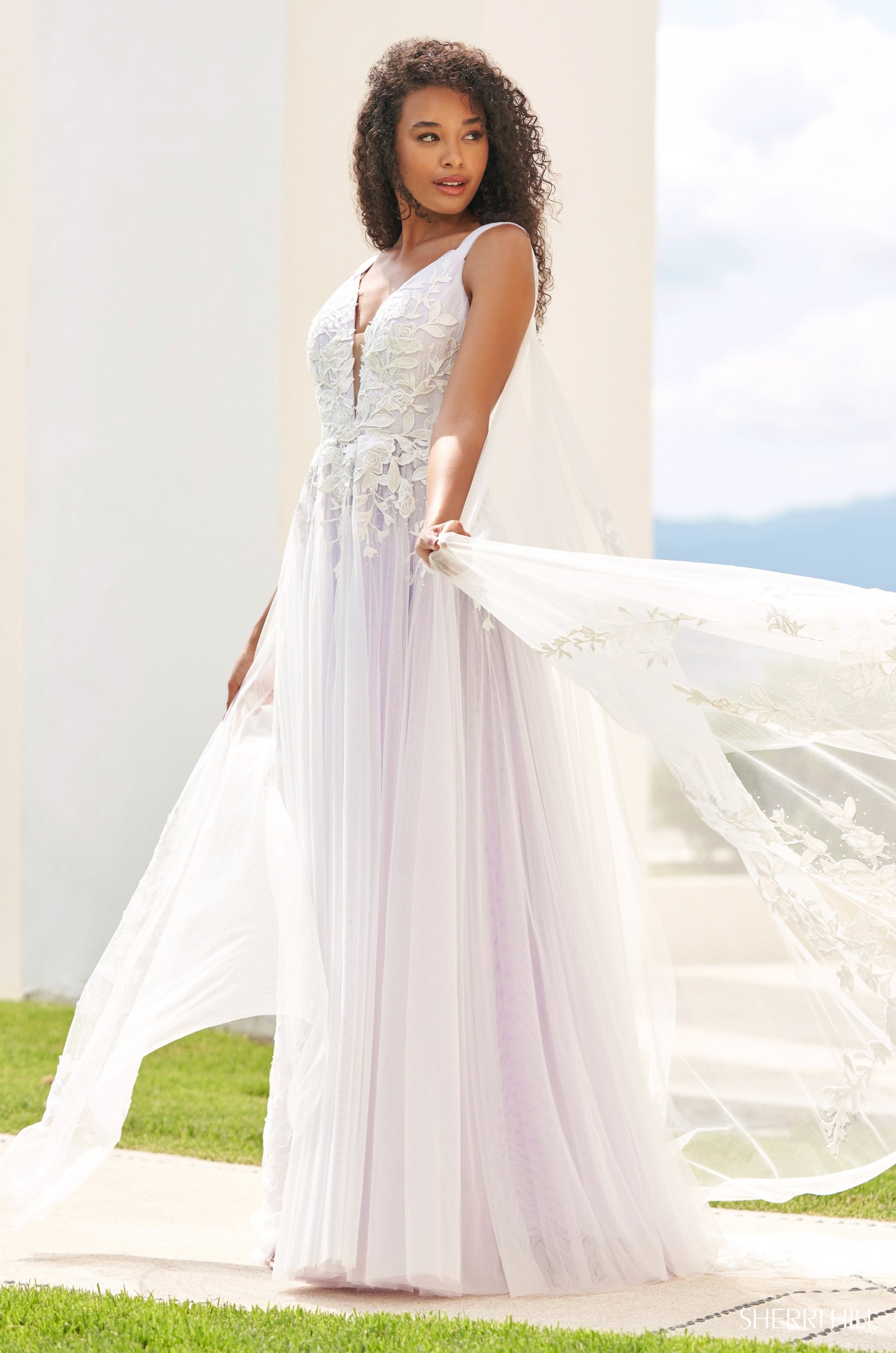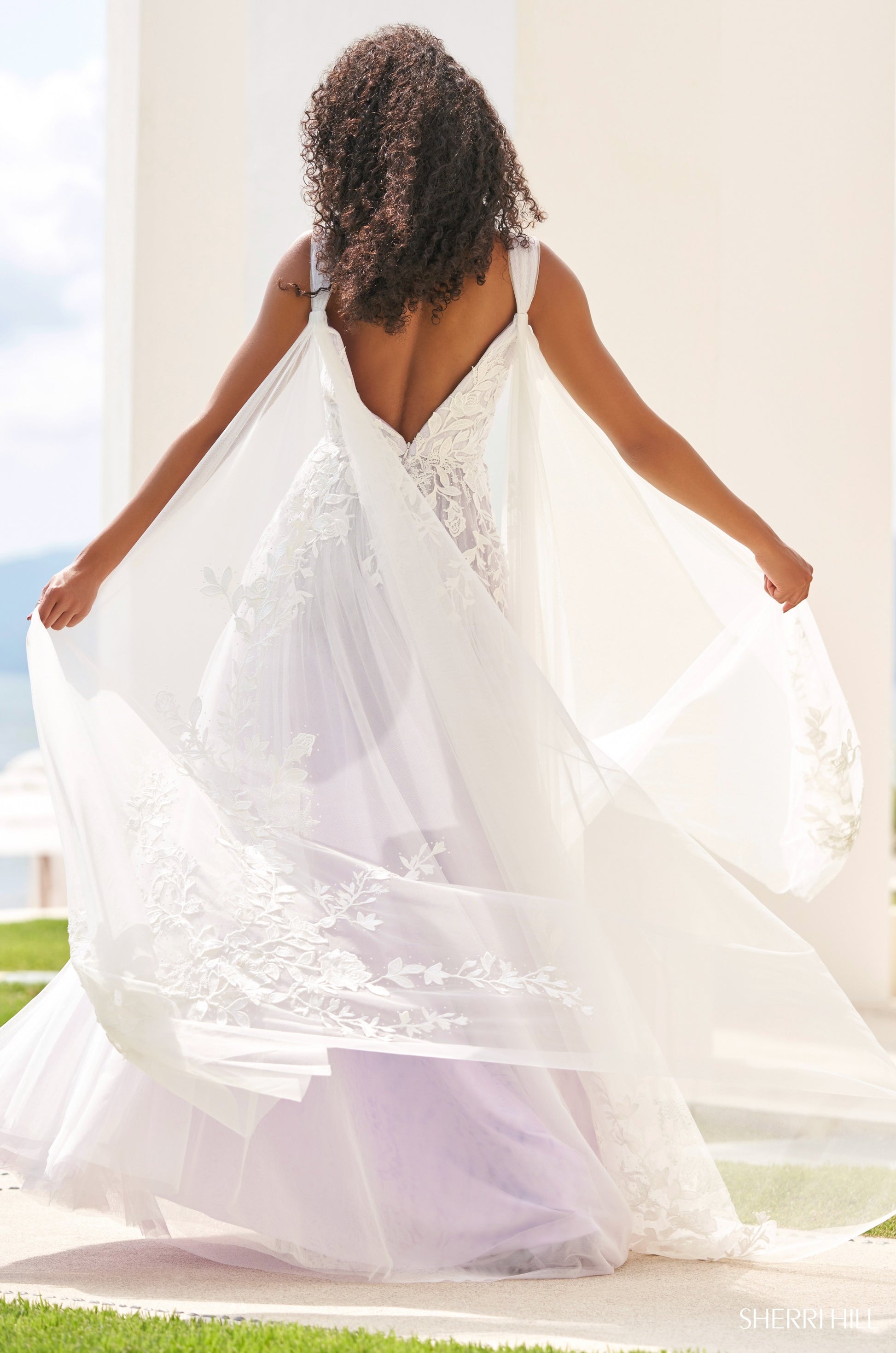 Sherri Hill 54859 Tulle ballgown with leaf lace embellishments, deep v-cut, and tulle cape. Available Color: Ivory/Light Blue