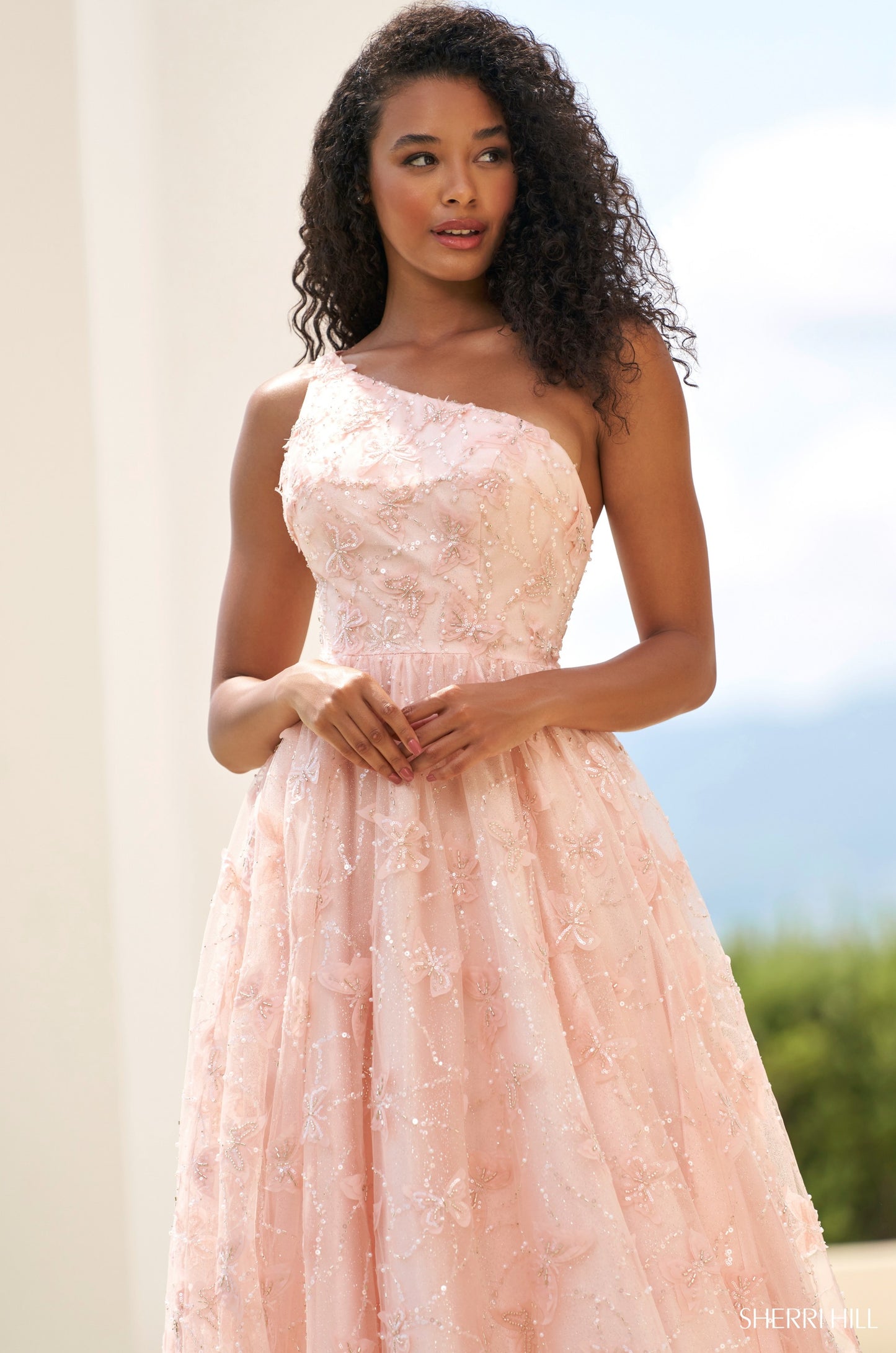 Sherri Hill 55049 glitter detailed one shoulder long dress. Available Color: Blush