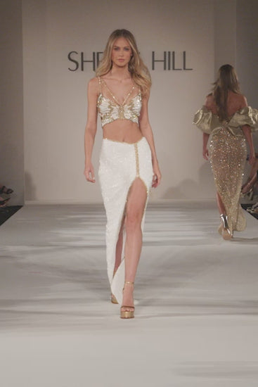 Sherri Hill 55409 Butterfly bugle beaded two-piece gown with beaded embellishments, high slit, and open back.