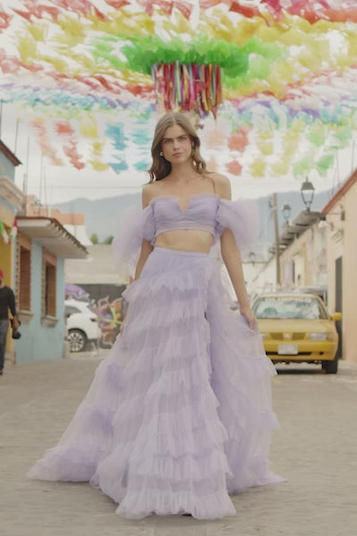 Sherri Hill 55591 Two piece tulle gown with ruffle embellishments on skirt, and ballon sleeves.