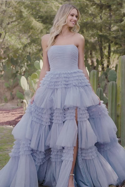 Sherri Hill 55677 Strapless tulle ball gown with ruffle skirt slit.