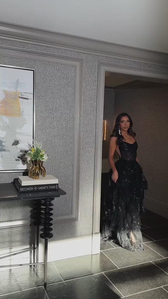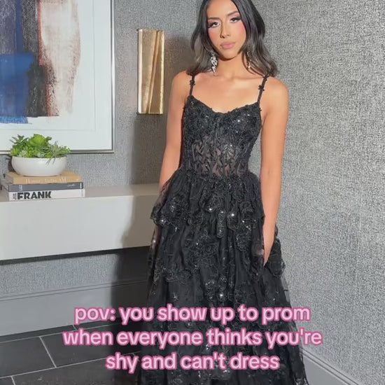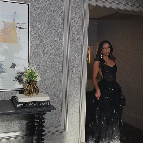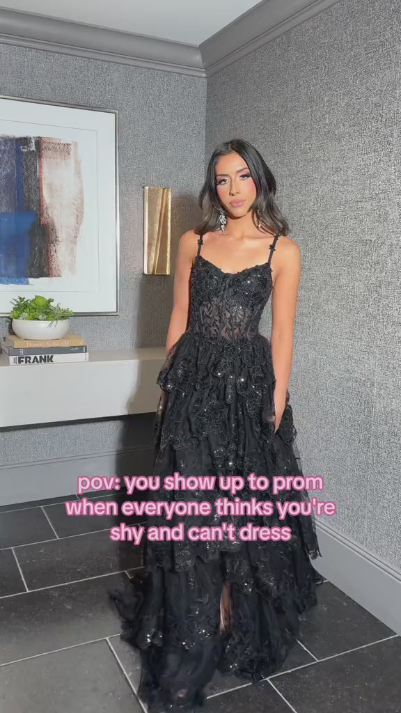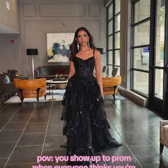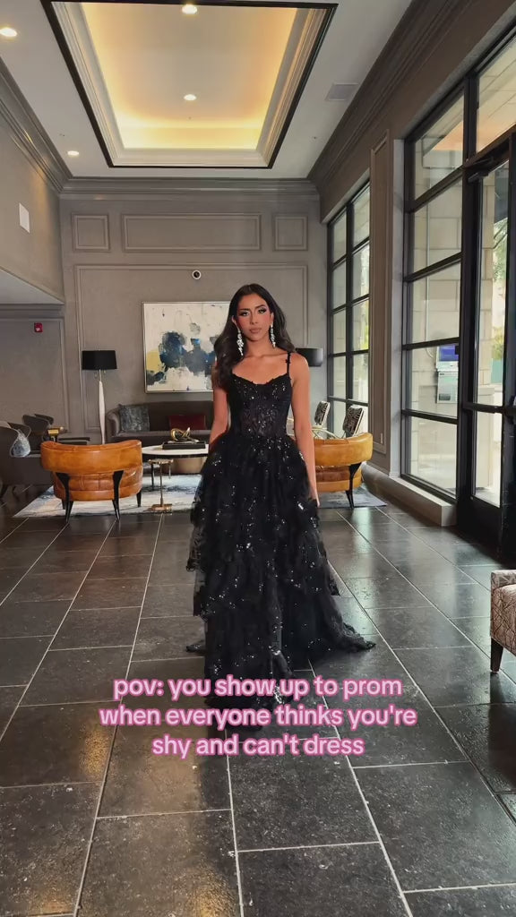 Introducing the Sophia Sequin Tiered Ruffle Corset Ball Gown, a mesmerizing masterpiece designed for queens who want to steal the spotlight. This tulle sequin A-Line gown features a sheer corset bodice, a corset back, and straps that beautifully accentuate your figure. The ruffle high slit skirt adds a touch of drama, making it the perfect choice for a night of elegance and glamour.