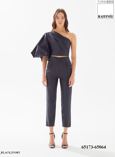 Tarik Ediz 65173 A two-piece evening jumpsuit made of taffeta that is asymmetrical and has fashionable bell sleeves.