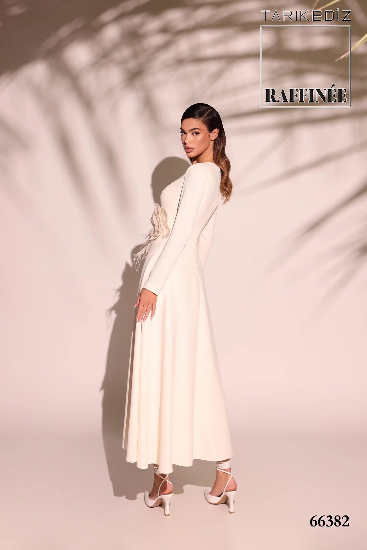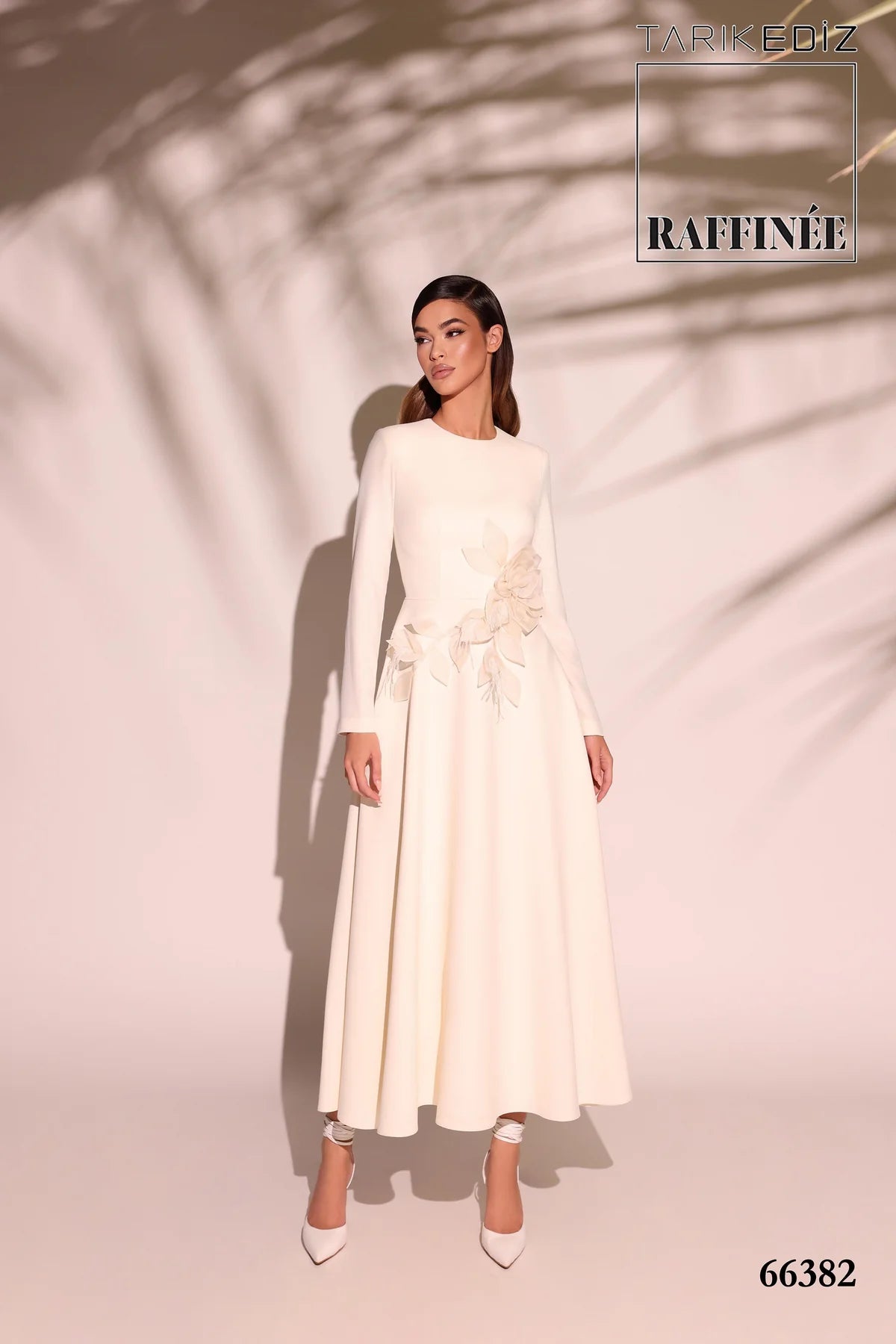 Discover the elegance of Tarik Ediz 66382, a crepe long dress with intricate flower details on the sleeves. Made with high quality crepe fabric, this dress exudes sophistication and grace for any formal occasion. Elevate your style with this statement piece.