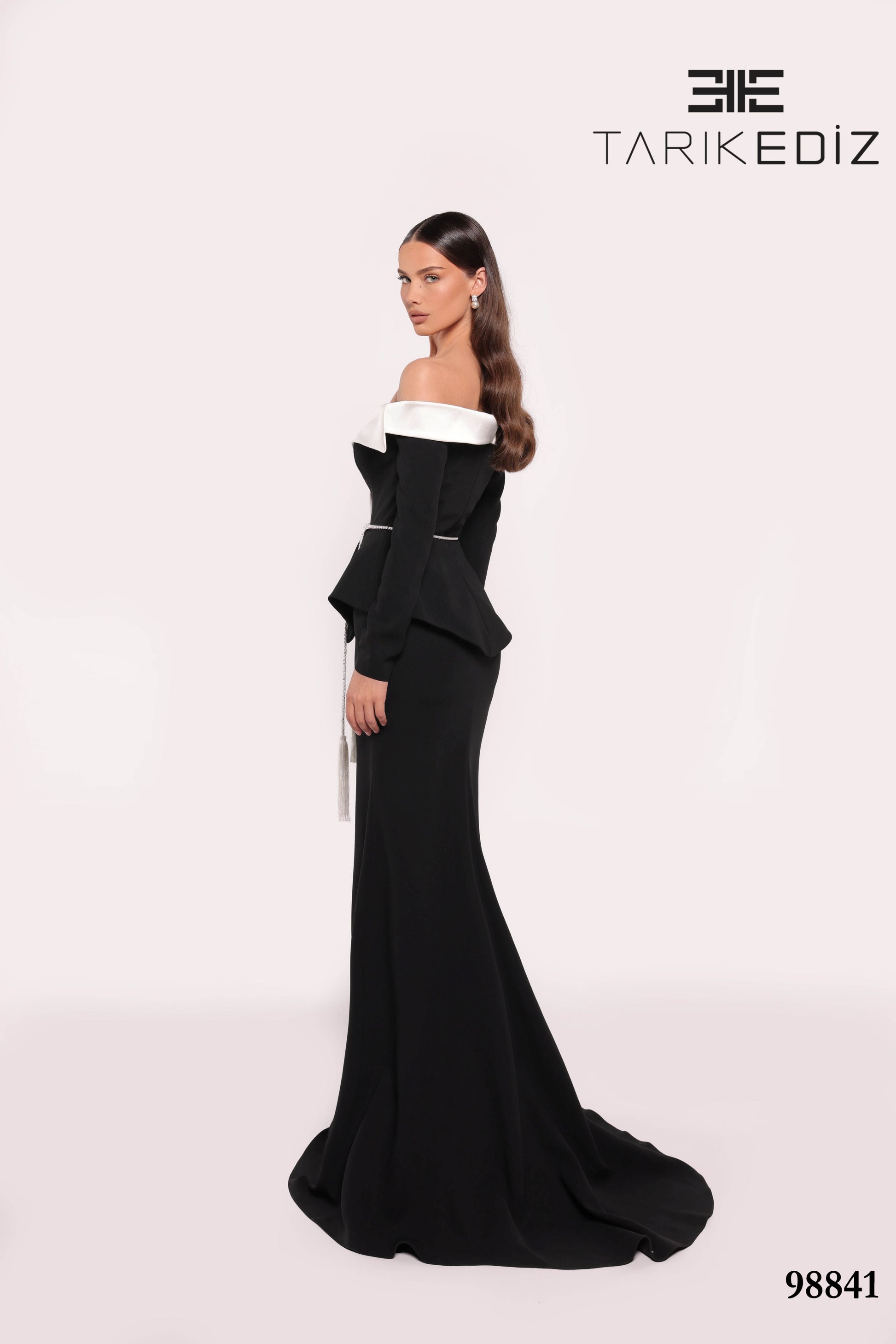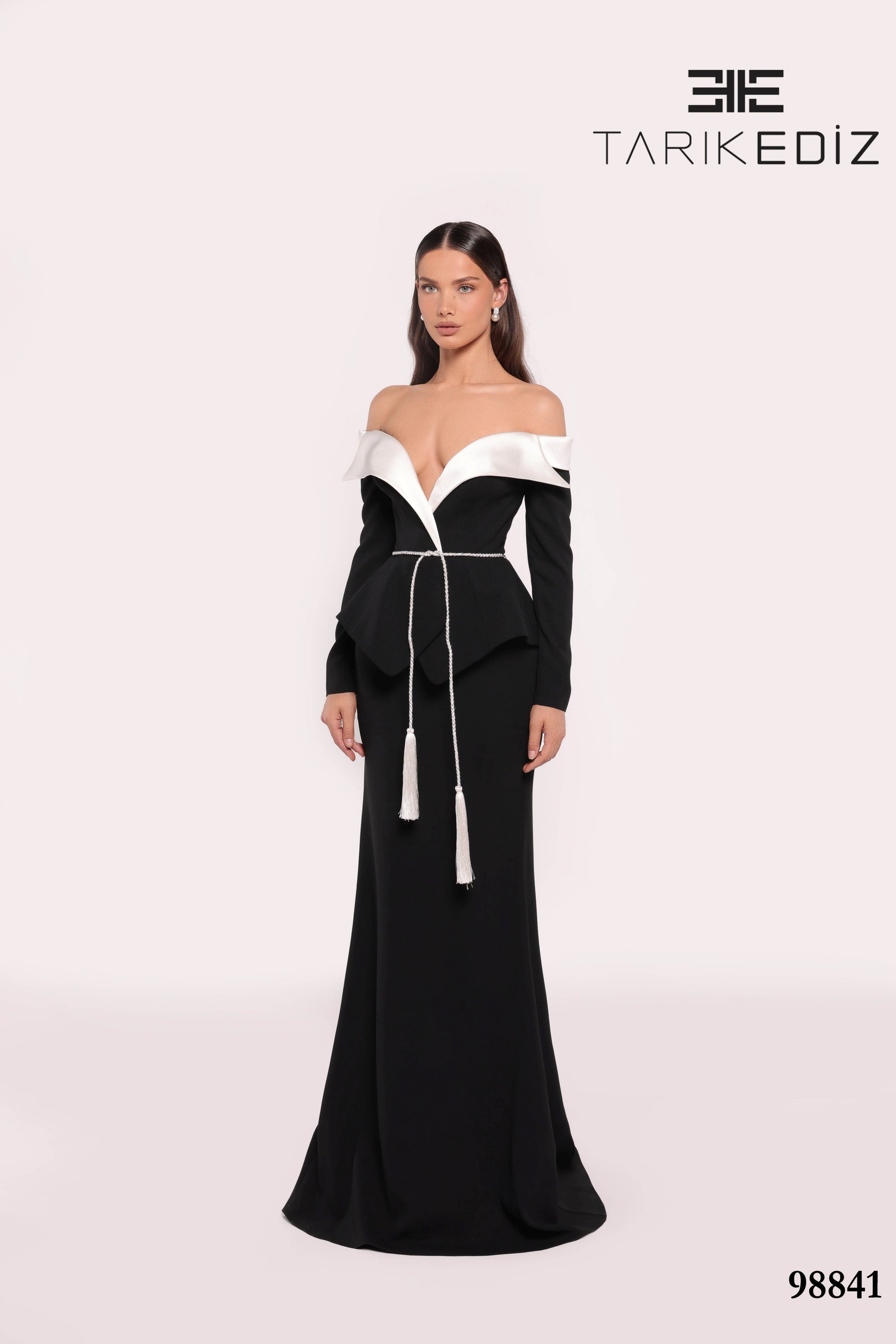This Tarik Ediz 98841 dress features a romantic off shoulder design with long sleeves and a sweetheart neckline. Crafted with luxe fabrics and intricate details, this dress exudes elegance and grace. Perfect for any formal occasion, it effortlessly combines sophistication and style.