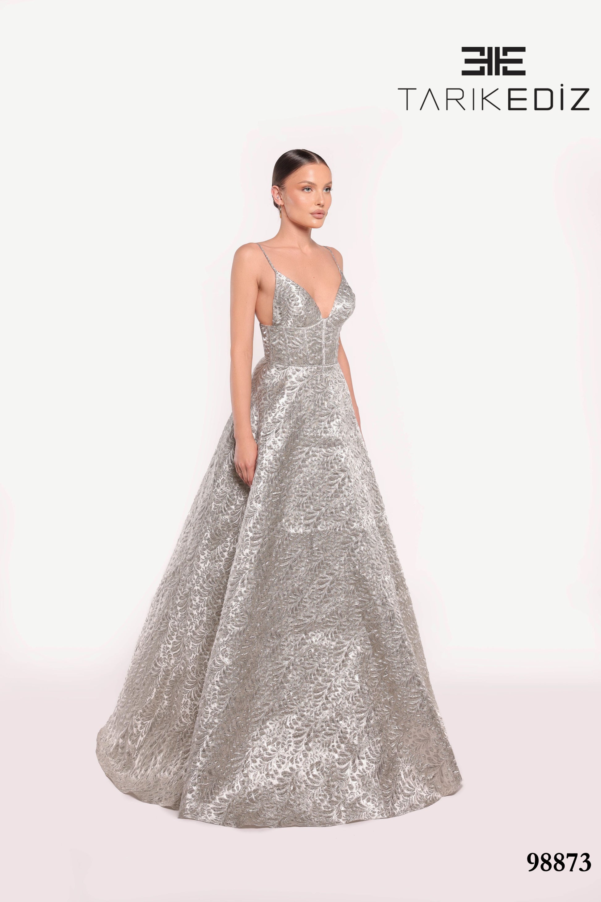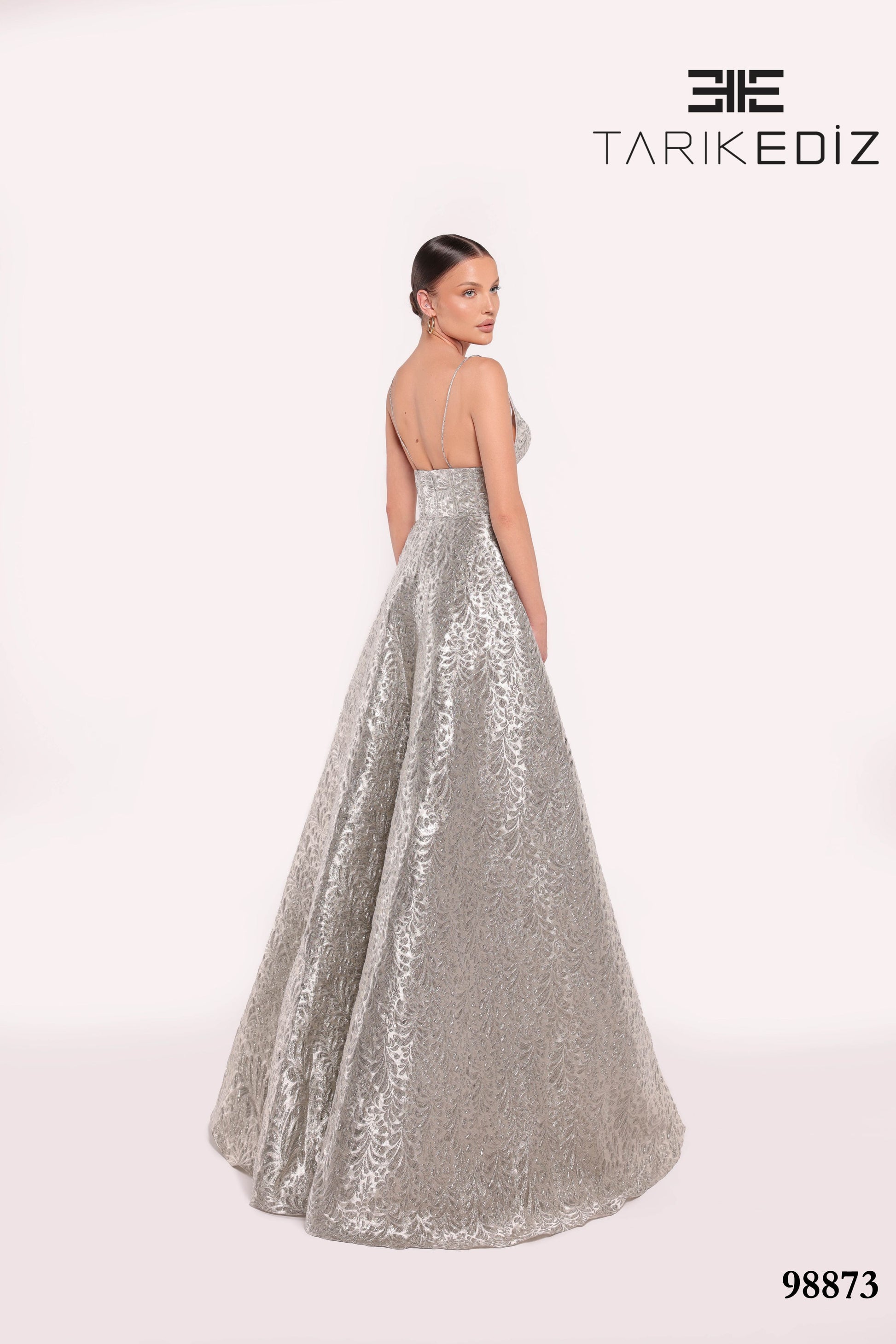 Expertly crafted by Tarik Ediz, the 98873 dress is a stunning choice for any formal occasion. Featuring metallic spaghetti straps and a sweetheart neckline, this dress exudes elegance and sophistication. The expertly designed silhouette will flatter your figure while the long length adds a touch of glamour. Perfect for making a statement at your next event.
