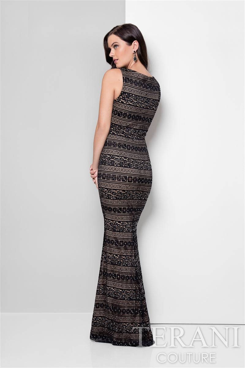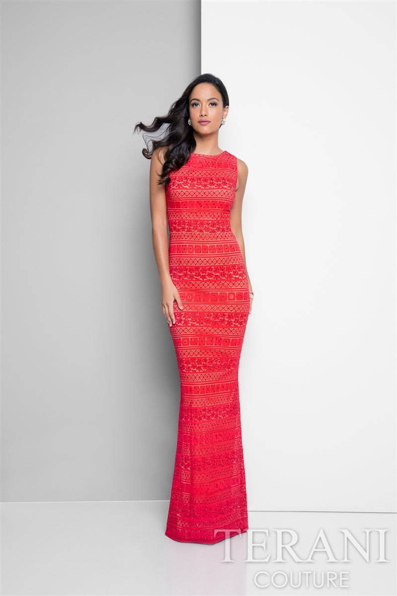 Sleek stretch lace red carpet ready special event gown with all over crystal accents. This sleeveless designer dress features a boat neckline and banded mixed motifs. and comes in black nude, red nude and royal nude.