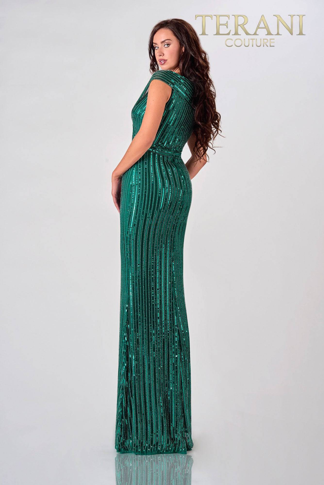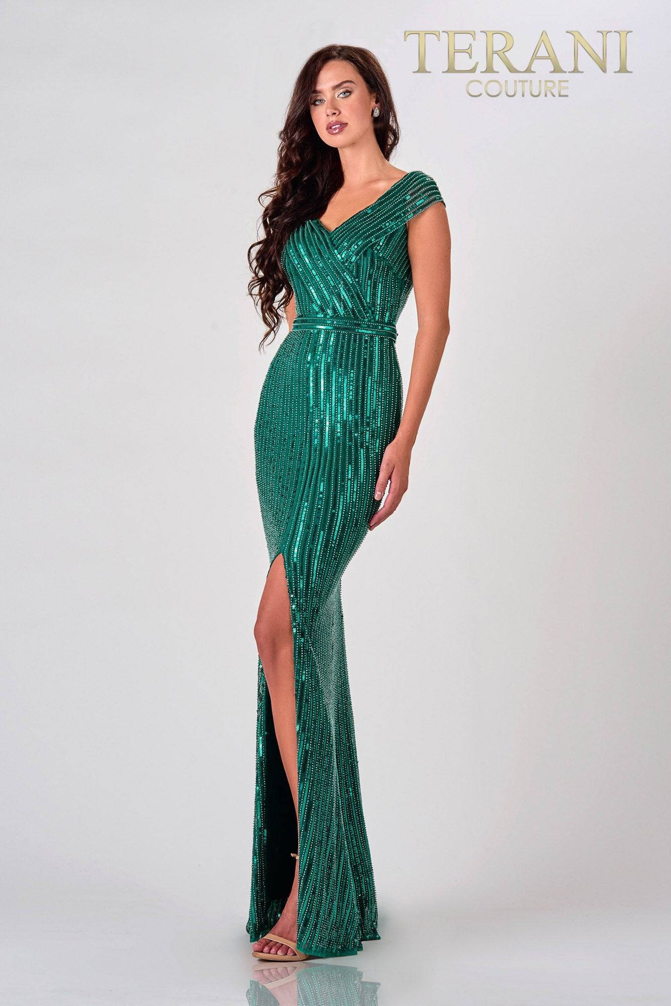 Terani Couture 2021M2980 Eye-catching hunter green mother of the bride dress with V-shaped neckline, a side slit and sequined lines all over.