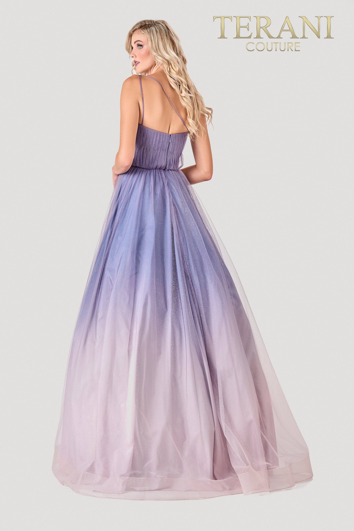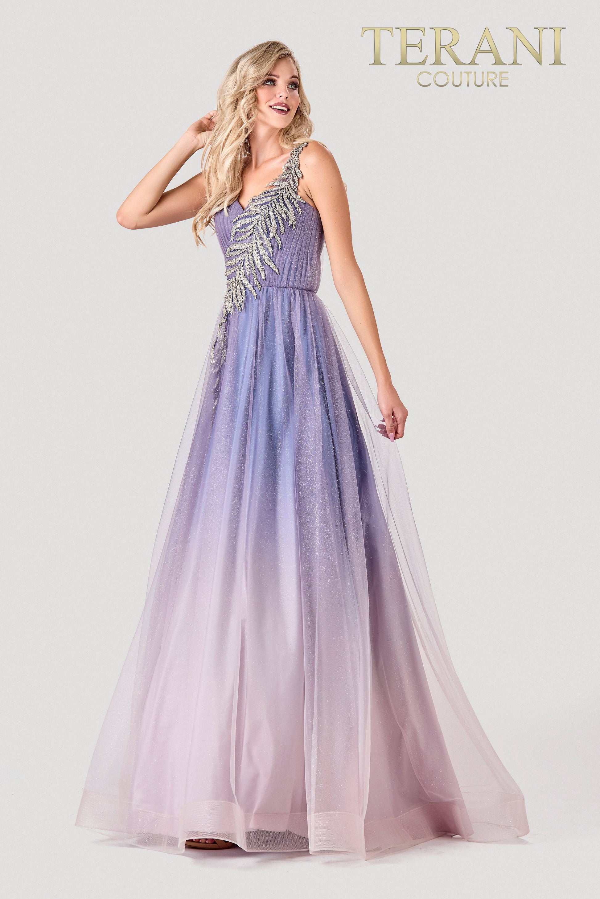 Terani Couture 2111P4110 Heavely ombre Blush Grey Prom Dress with a pleated bodice and a decorative leaf pattern embellished asymmetrically.
