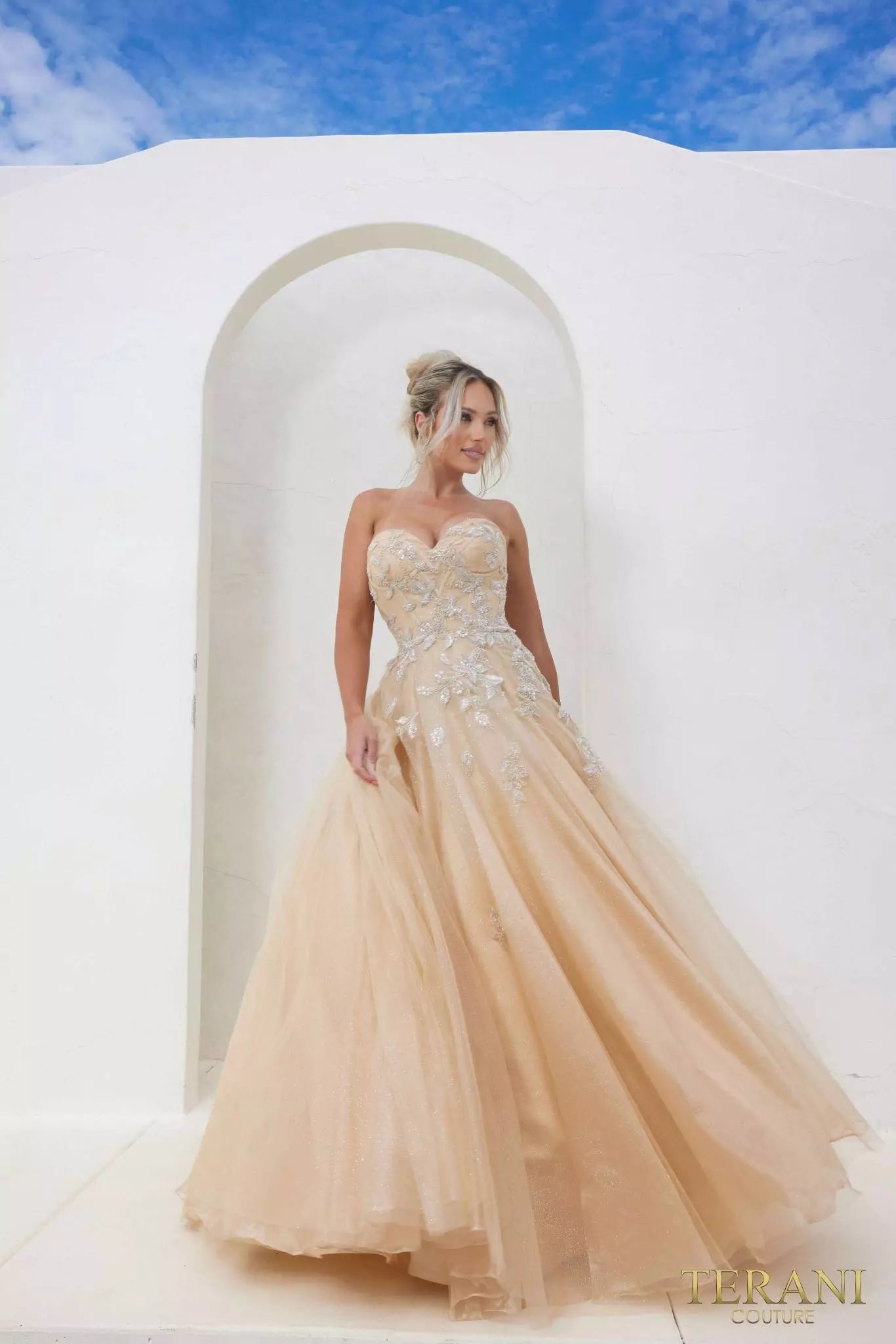 Terani Couture 241P2216 Off-Shoulder Glitter Tulle Champagne Ballgown Prom Dress