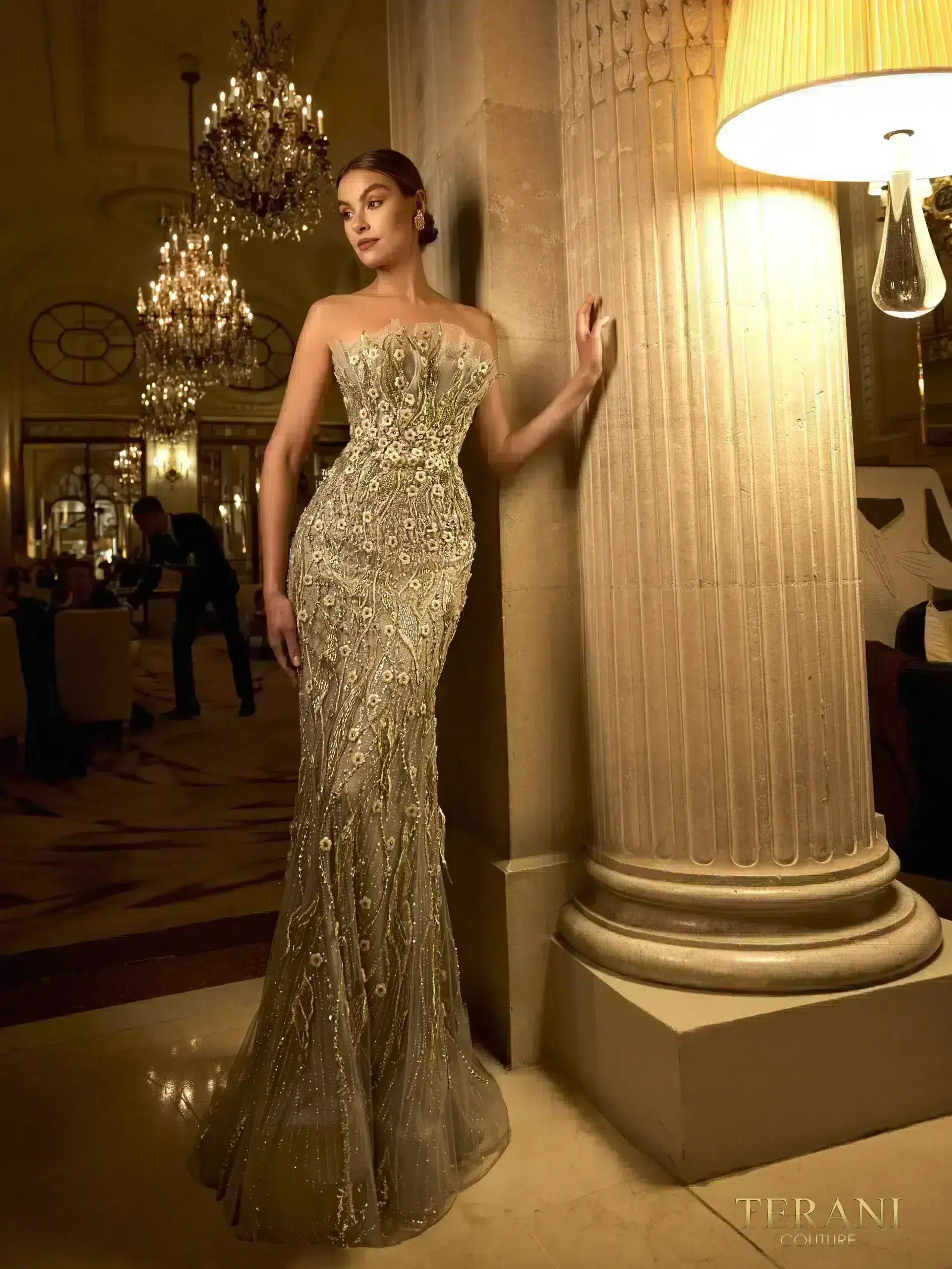 This gorgeous long dress with slim silhouette is sure to make a statement at any special occasion. The halter neckline and strapless design come together to create a modern and sophisticated look. Made of tulle, a lightweight and flowy fabric that drapes gracefully, this charming gown is available in a cream silver color with a metallic sheen, giving it a touch of glamour and sophistication. The hook and eye closure at the back ensures a comfortable and secure fit, while the zipper location at the back allows for easy wear and removal. Don’t miss out on the opportunity to add this stunning dress to your wardrobe today.